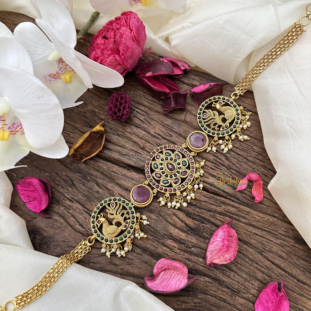 Elevate your style with our exquisite Red-Green Stone Peacock Choker-Pearl. Crafted with a stunning red-green stone and two side peacocks, this choker exudes luxury and sophistication. Add a touch of elegance to any outfit with this exclusive piece.