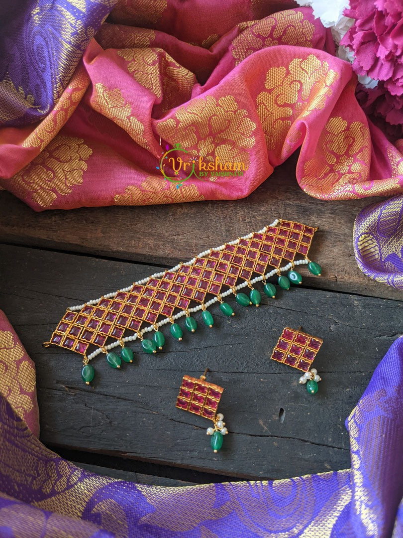Red Kemp High Neck Choker – Premium choker with pearl line and green bead finish. Comes with matching ear hangings.