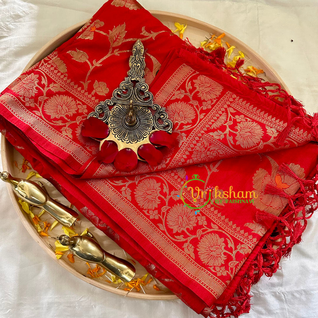Red Semi Benarasi Saree – Festive wear saree –Embroidery work throughout the saree; comes with Blouse attached. Two side traditional border.