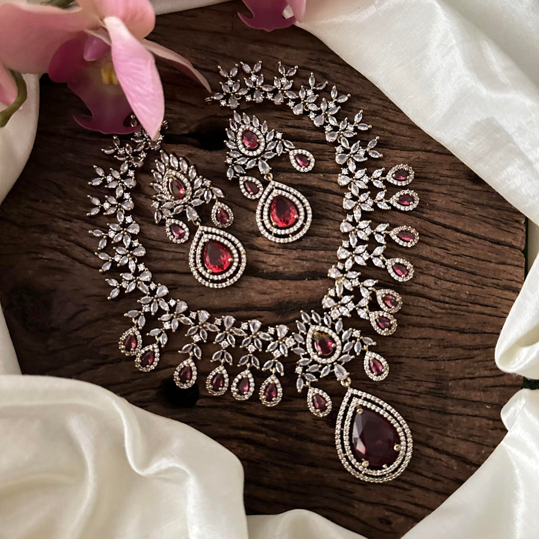 This elegant Red Victorian Diamond Short Neckpiece features a stunning tear drop design pendant that will add a touch of sophistication to any outfit. The red diamond adds a pop of color while the Victorian style gives a vintage touch. Elevate your look with this stylish and unique neckpiece. Comes with matching earrings.