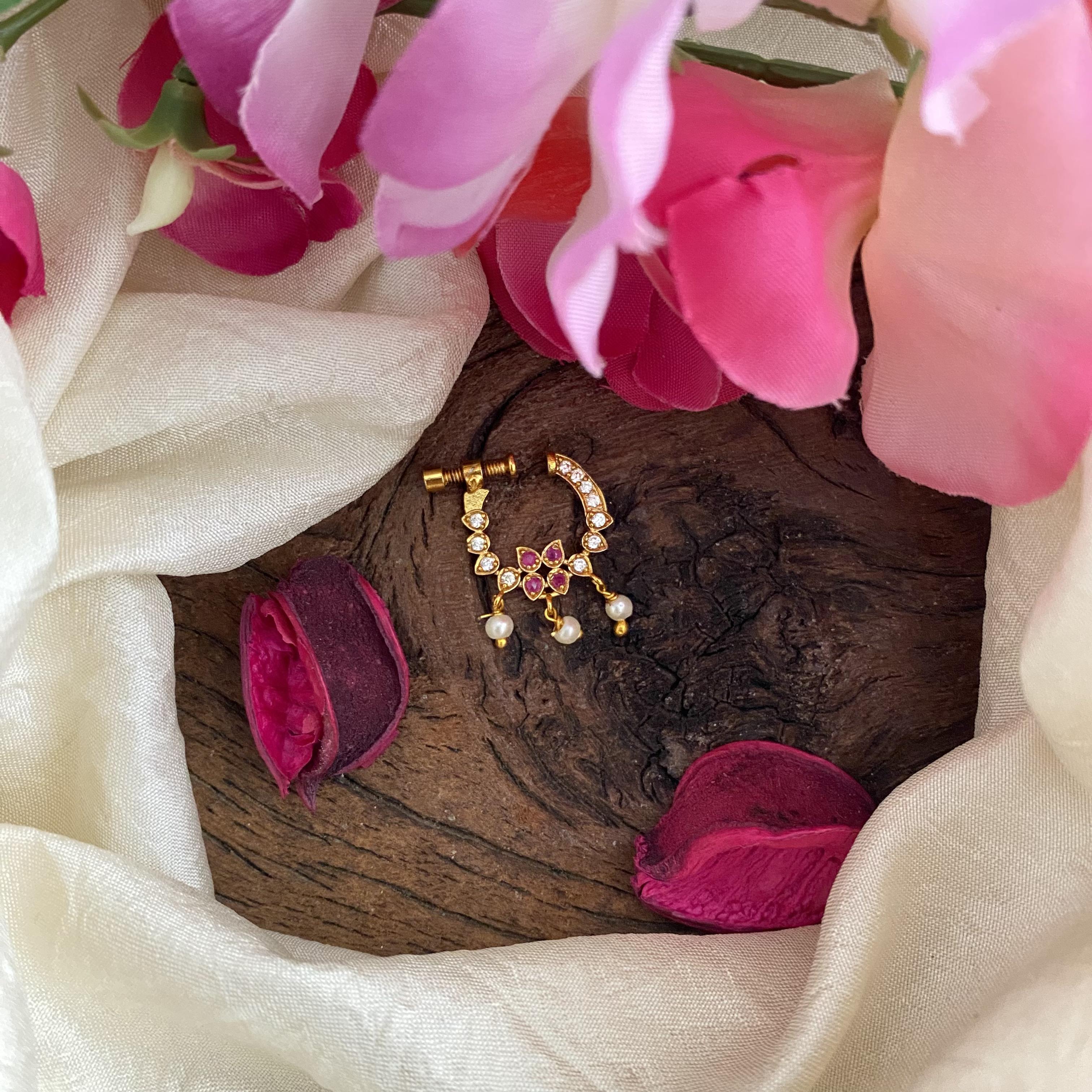 Red White AD Stone Nath / Nose pin-Pearl-G13799