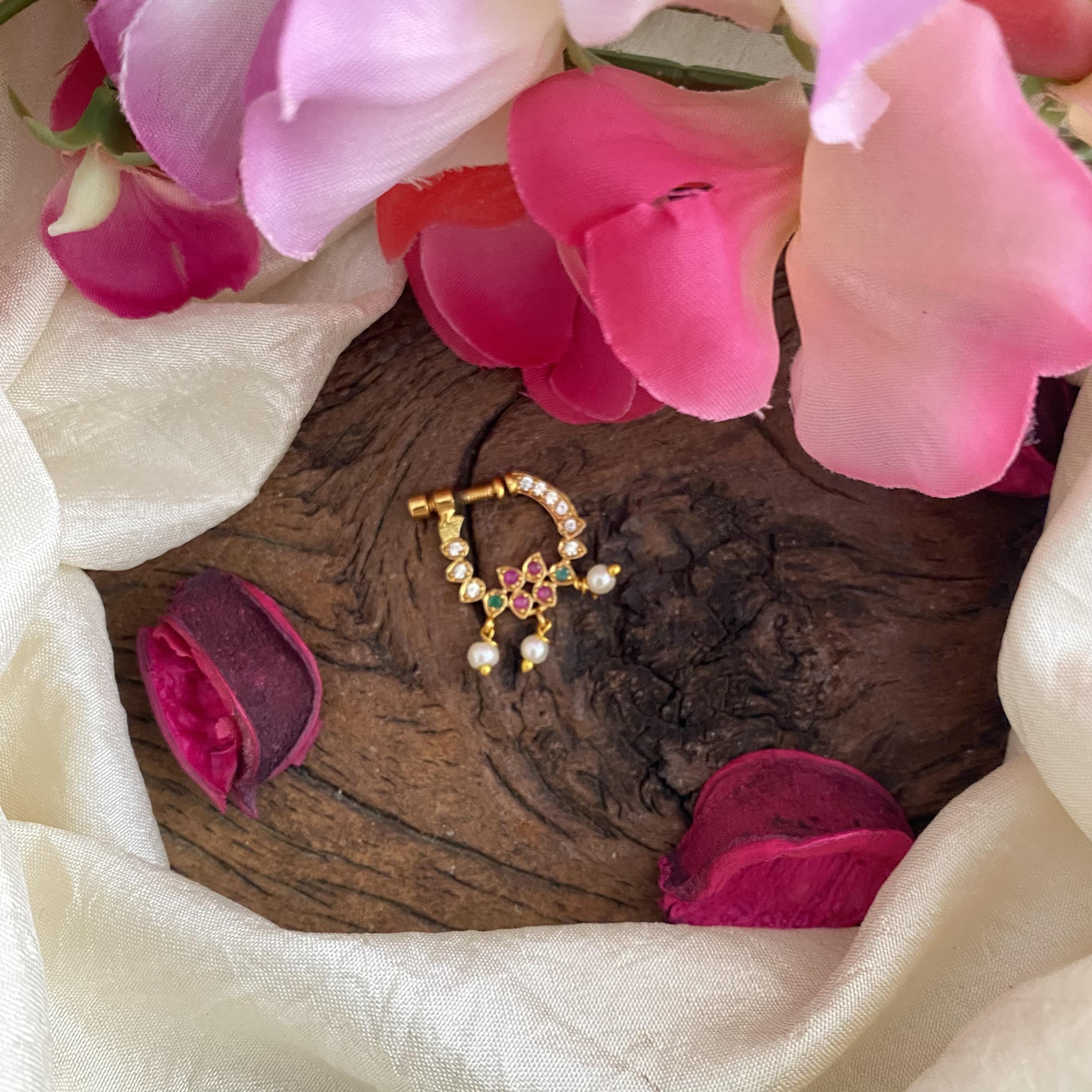 Red White Green AD Stone Nath / Nose pin-Pearl-G13796