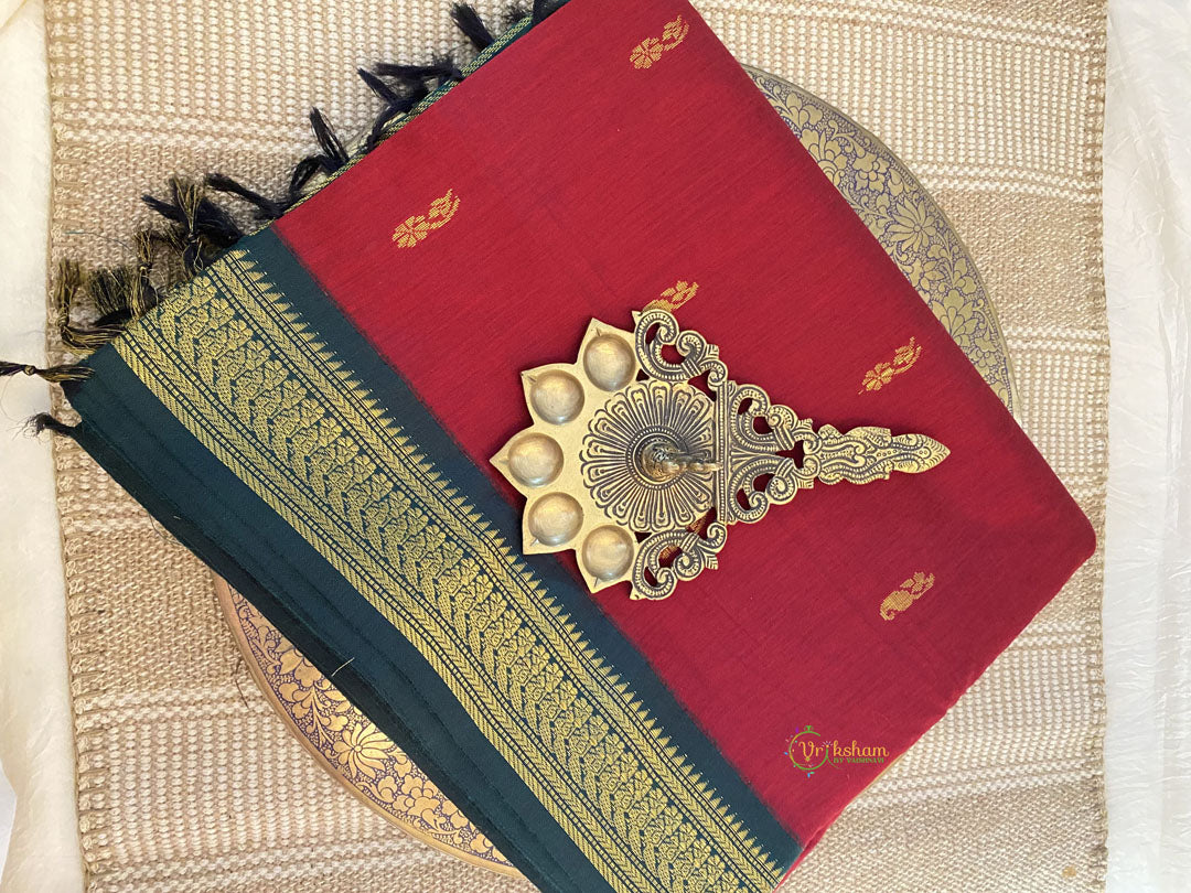 Red With Dark Green Border -Kalyani Cotton Saree -These sarees are highly comfort, versatility, and timeless appeal, making them a popular choice for both casual and formal occasions. Whether worn during festive celebrations, weddings, or everyday wear, Kalyani Cotton Sarees exude grace and sophistication, embodying the essence of Indian tradition and craftsmanship - comes with Blouse attached. Contrast border saree. Poly mix cotton.