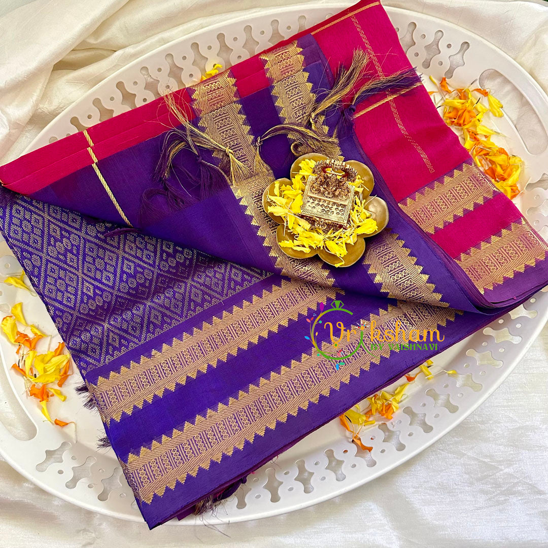 Reddish Pink Kattam Silk Cotton Saree - Kattam Festive wear saree ; comes with Blouse attached. Two side contrast border and pallu.