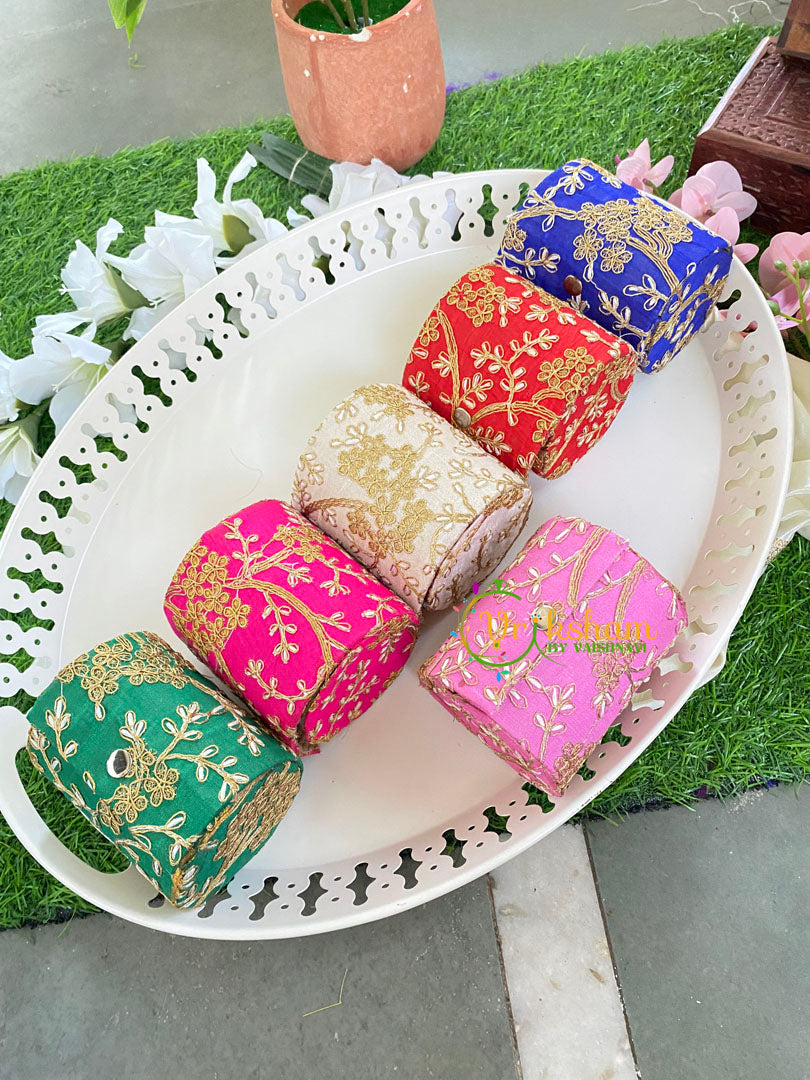 Return Gift Bangle Box -4 Inches cylindrical shaped bangle box - assorted colors - floral pattern - gold thread work comes with a separator.