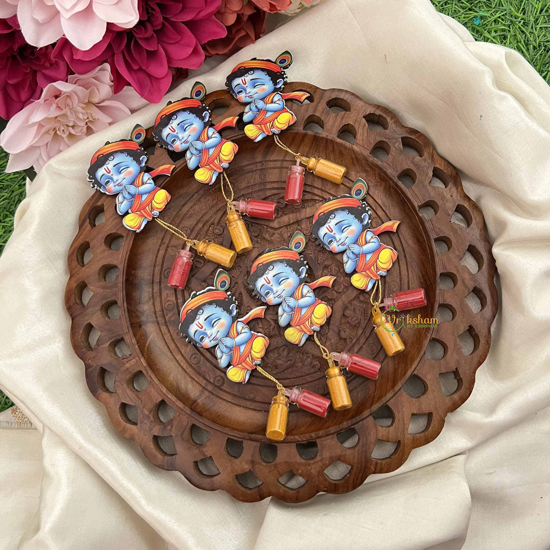 Celebrate divine charm with this elegant set of six Bal Krishna decorative stickers, each accompanied by kumkum and haldi. Ideal as return gifts, these stickers capture the playful yet spiritual essence of Lord Krishna, adding a touch of grace and devotion to your special occasions. Their refined design elevates the cultural significance of any celebration.