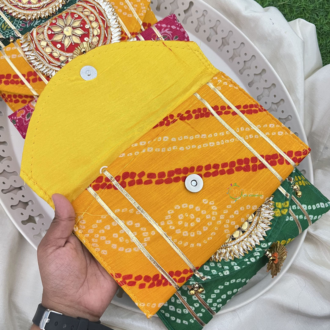 Elevate your gifting with this exquisite set of six Bandhani clutch purses, each adorned with intricate thread work and elegant Gota Patti detailing. These handcrafted handbags blend traditional artistry with refined style, making them perfect as memorable return gifts. Compact yet spacious, they offer both beauty and practicality, adding a touch of sophistication to any occasion.