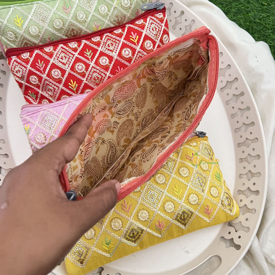 Return Gift Hand Bags-Embroidered Zipper Purse With Thread Work-6 Pieces Set-Thread work-Closing drawsting is made up of pearls -6 pieces Set- assorted colors.