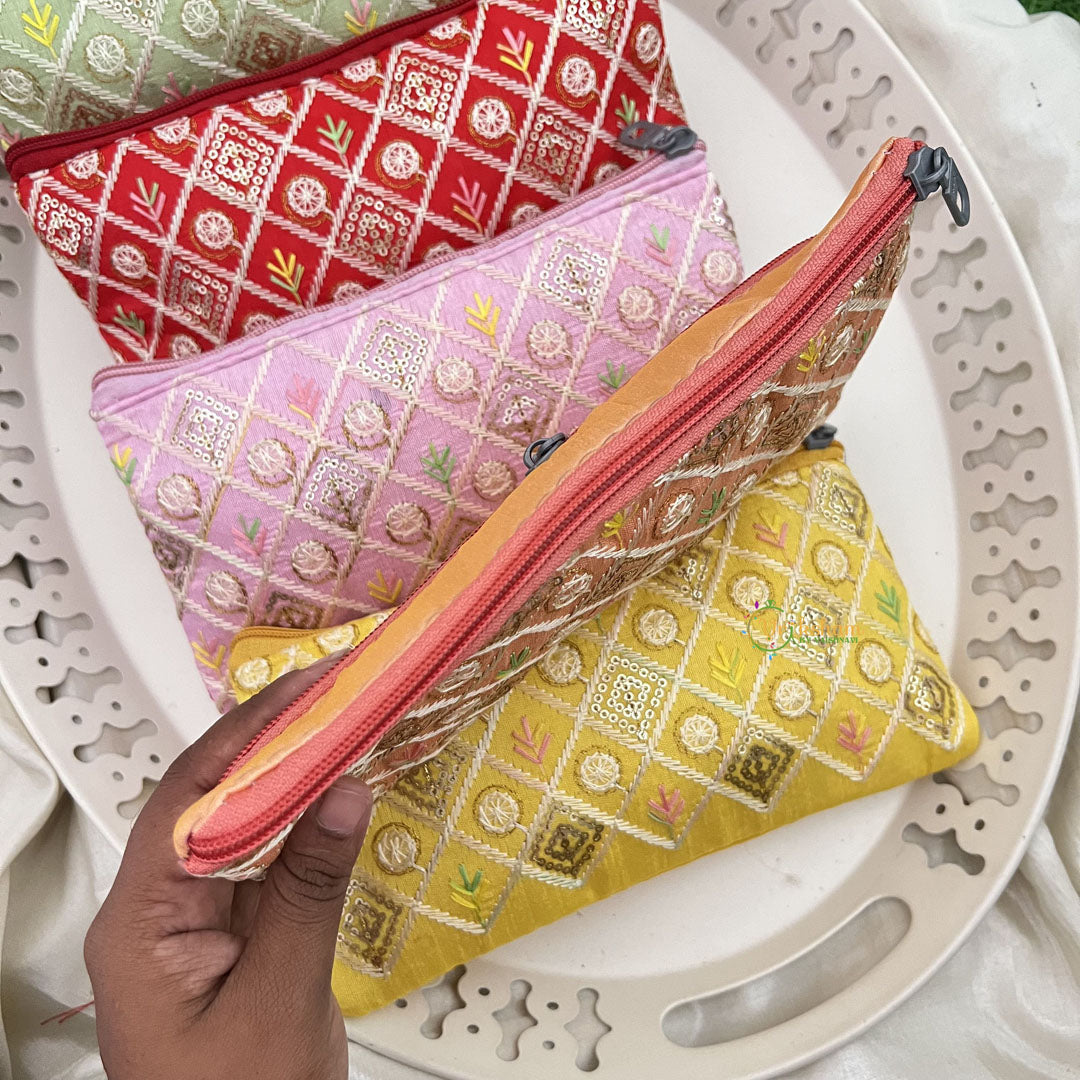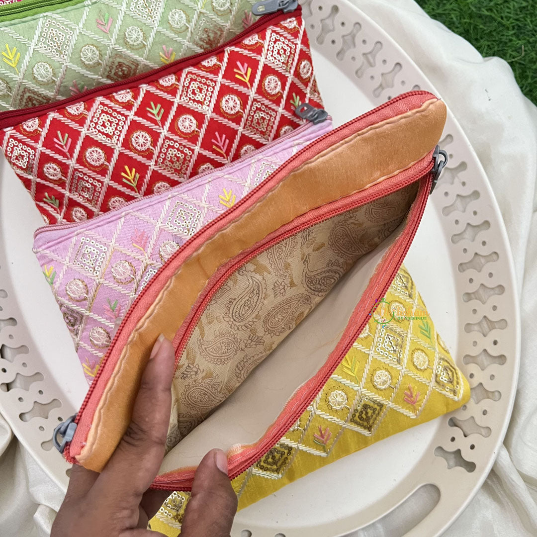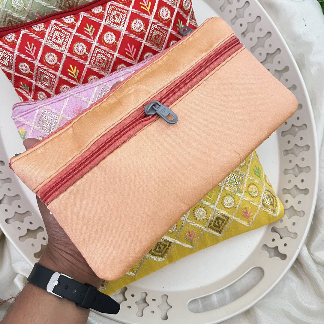Elevate your gifting experience with this exquisite set of six embroidered zipper purses. Each purse showcases intricate thread work, blending timeless craftsmanship with practical design. Perfect as return gifts, these hand bags offer a refined touch of elegance while providing secure storage with their smooth zipper closures. Ideal for special occasions, they make lasting impressions with their artisanal detail and sophisticated appeal.