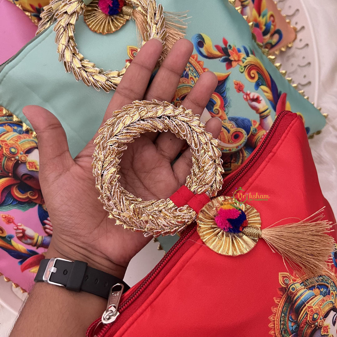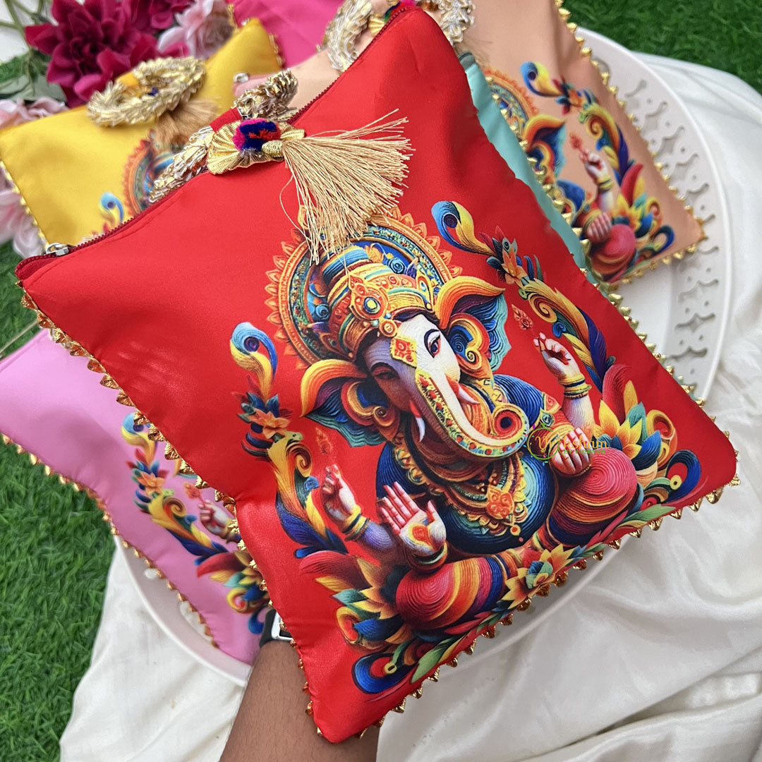 Elevate your gifting experience with this set of six ethnic Ganpati gift pouches, each featuring an elegant golden handle. Designed for cultural celebrations, these return gift hand bags blend traditional charm with refined craftsmanship. Perfect for presenting small tokens of appreciation, they add a sophisticated touch to any festive occasion.