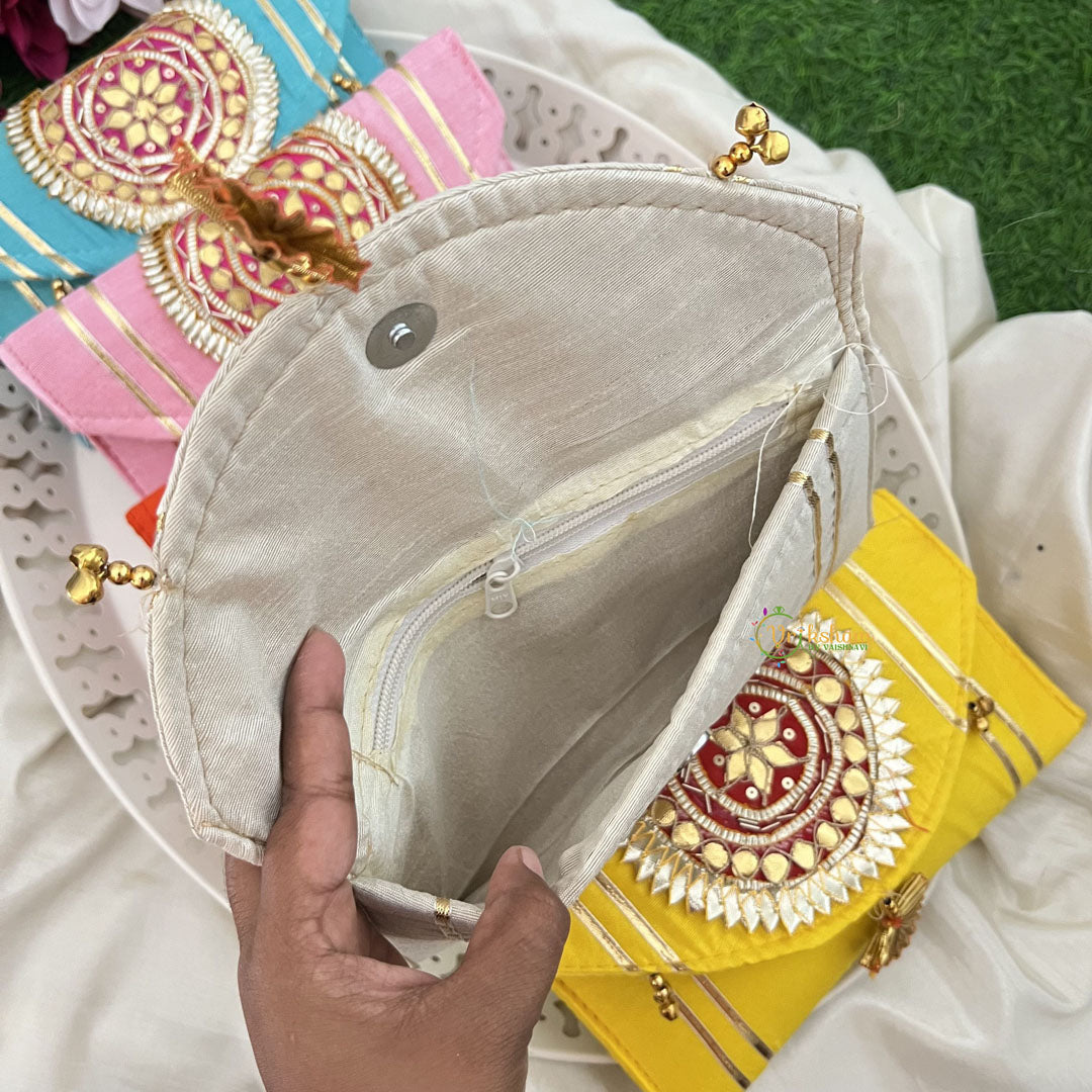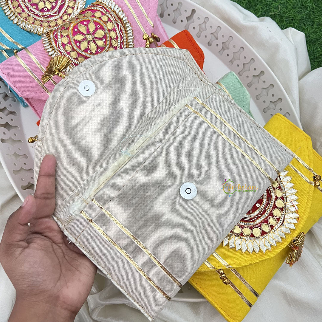 Elevate your celebrations with this elegant set of six festive envelope purses. Featuring intricate thread work and delicate Gota Patti detailing, these hand bags combine traditional craftsmanship with a refined design. Perfect as return gifts, they offer both style and practicality, making them a thoughtful keepsake for your guests.