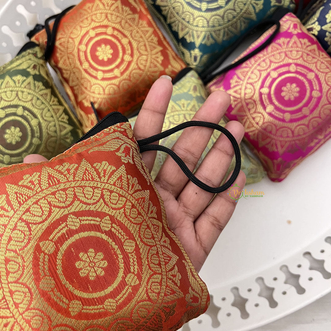 This set of six traditional Indian mani pouches serves as elegant return gift hand bags, blending cultural charm with practical use. Crafted to reflect timeless Indian artistry, each pouch offers a refined way to present favors or small treasures during special occasions. Their intricate design and vibrant colors make them not just gifts, but memorable keepsakes that guests will appreciate and cherish. Perfect for weddings, festivals, or cultural celebrations requiring a sophisticated touch.