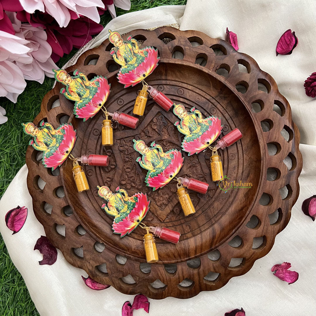This sophisticated set of six Lakshmi Mata Blessing Packs includes premium kumkum and haldi, thoughtfully prepared to convey auspicious blessings. Ideal as return gifts, each pack honors tradition with elegance, offering a meaningful and refined way to celebrate cultural heritage during special occasions.