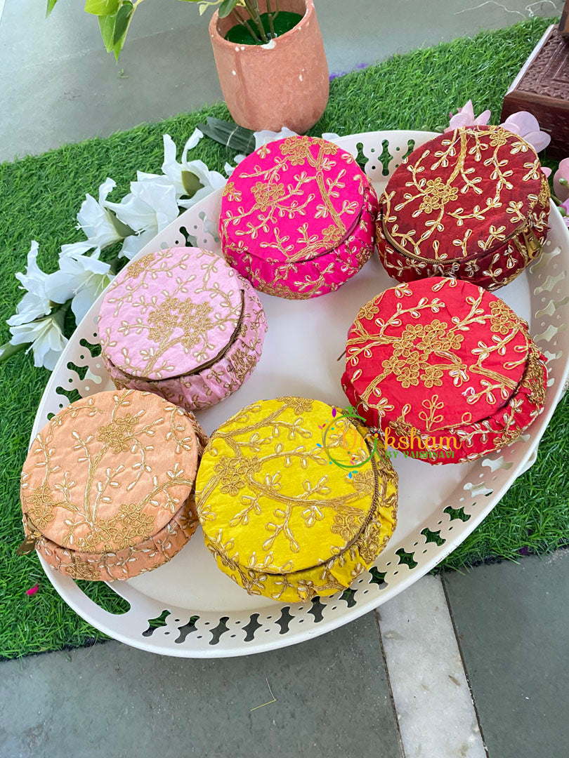 Return Gift Matki Box -5 Inch pot shaped bangle box - assorted colors - floral pattern - gold thread work.