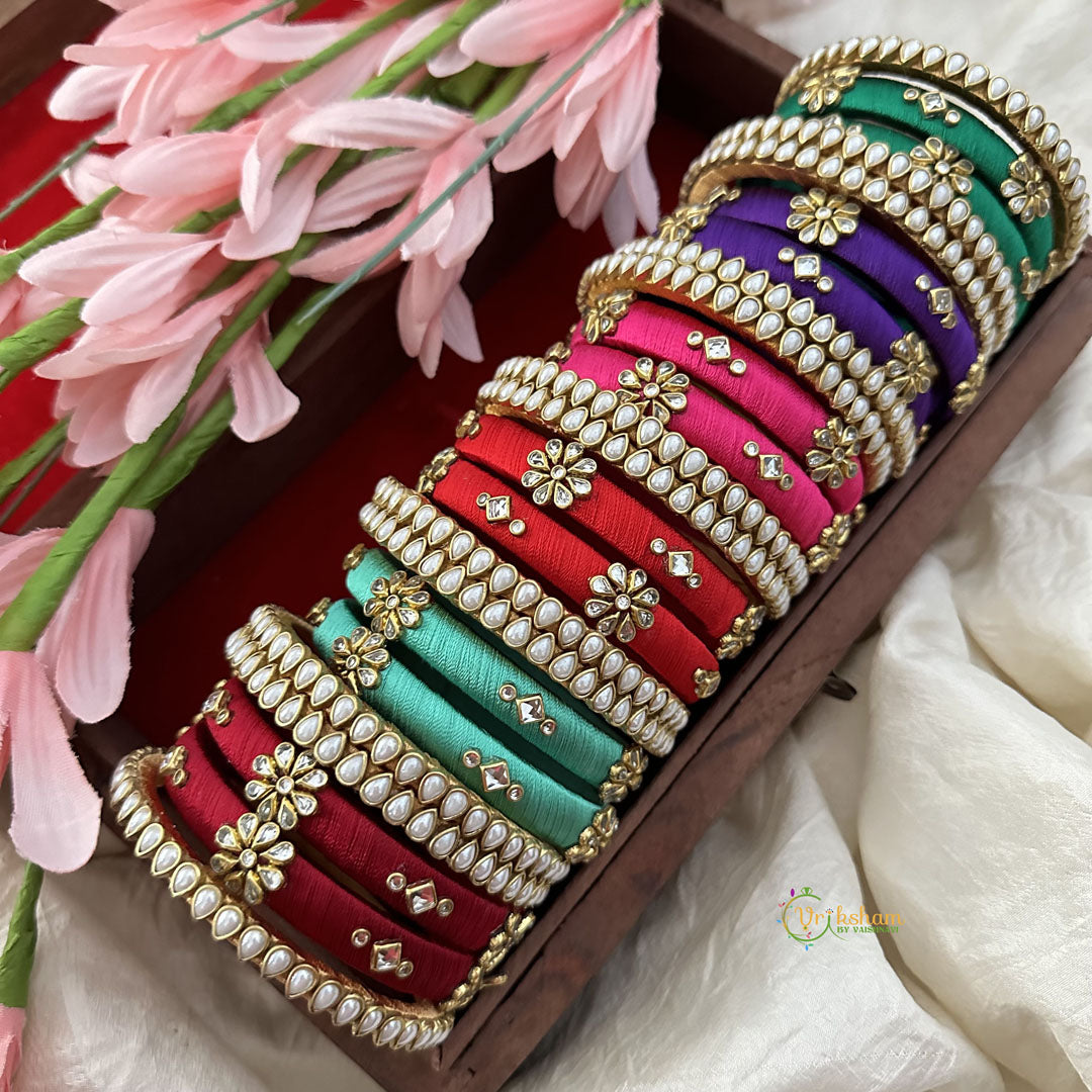 Return Gift Package -Silk Thread Bangles-Kundan Stones-Set 3- set of 6 different color broad bangles with floral kundan pattern - each 2 pieces. Comes as full set only (6 Sets).