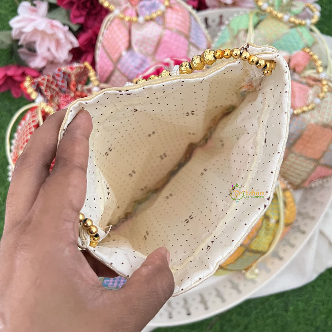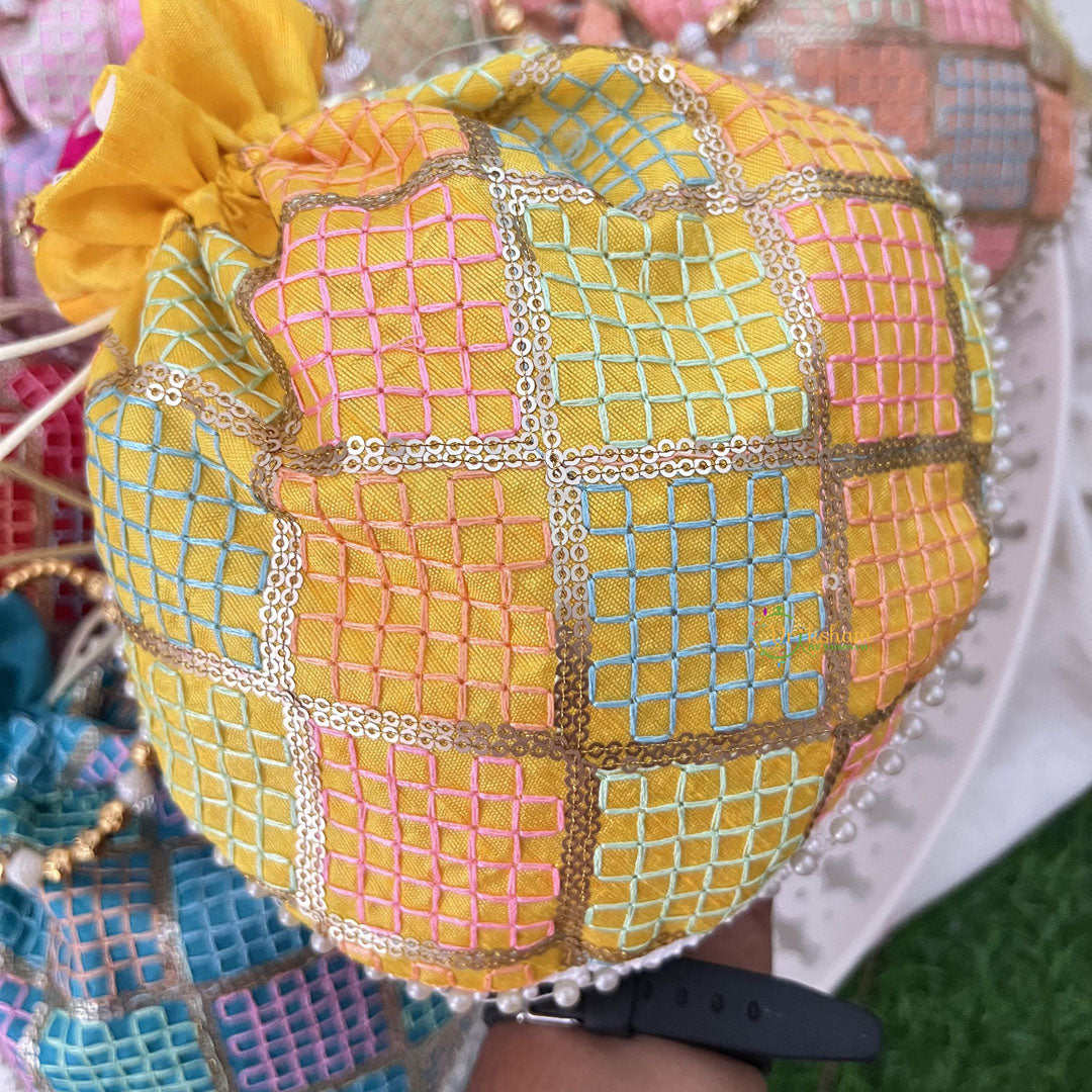 Elevate your gifting experience with this set of six elegant potli bags, featuring intricate geometric embroidery and refined pearl bead handles. Perfectly sized for return gifts, these bags blend traditional craftsmanship with a sophisticated touch, adding charm and grace to any occasion. Crafted to impress, they offer a stylish and memorable way to present your tokens of appreciation.