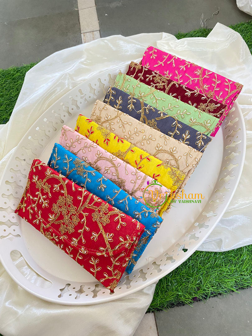 Return Gift Pouches -Thread Work Pouches -6 pieces Set- assorted colors - floral pattern - gold thread work.