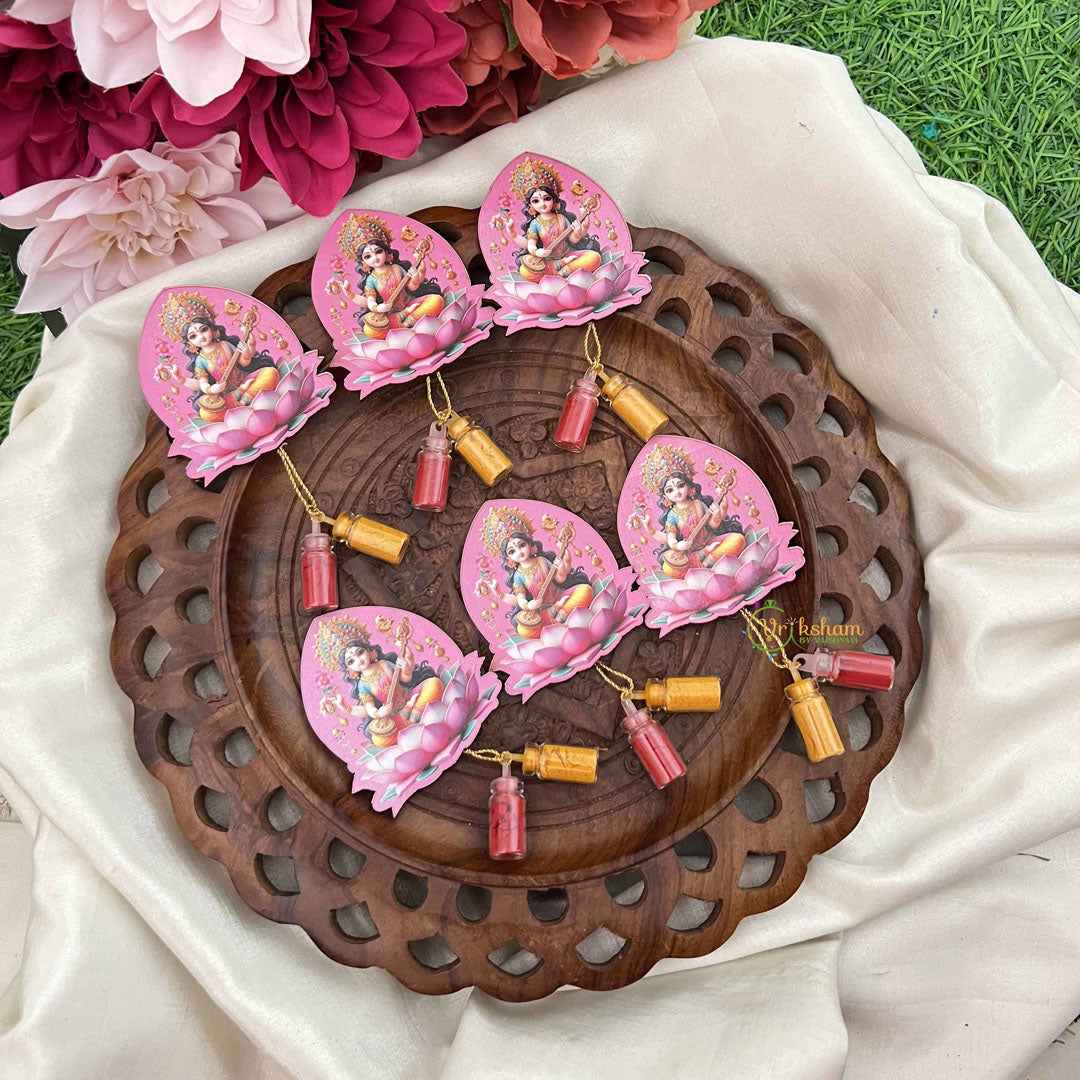 Celebrate wisdom and creativity with this elegant set of six Saraswathi decorative stickers, each accompanied by kumkum and haldi. Perfect for return gifts, these stickers evoke the blessings of the Goddess of knowledge, making your special occasions more meaningful and refined. Their graceful design adds a cultured and spiritual touch to any event.