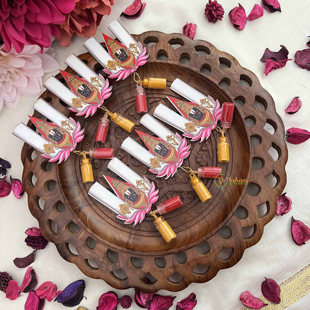 Celebrate tradition with this sophisticated set of six Shree Balaji decorative stickers, thoughtfully paired with kumkum and haldi. Perfect for return gifts, each sticker embodies divine blessings and adds a graceful touch to your festive moments. This set blends cultural significance with elegant presentation, ideal for enhancing any auspicious occasion.