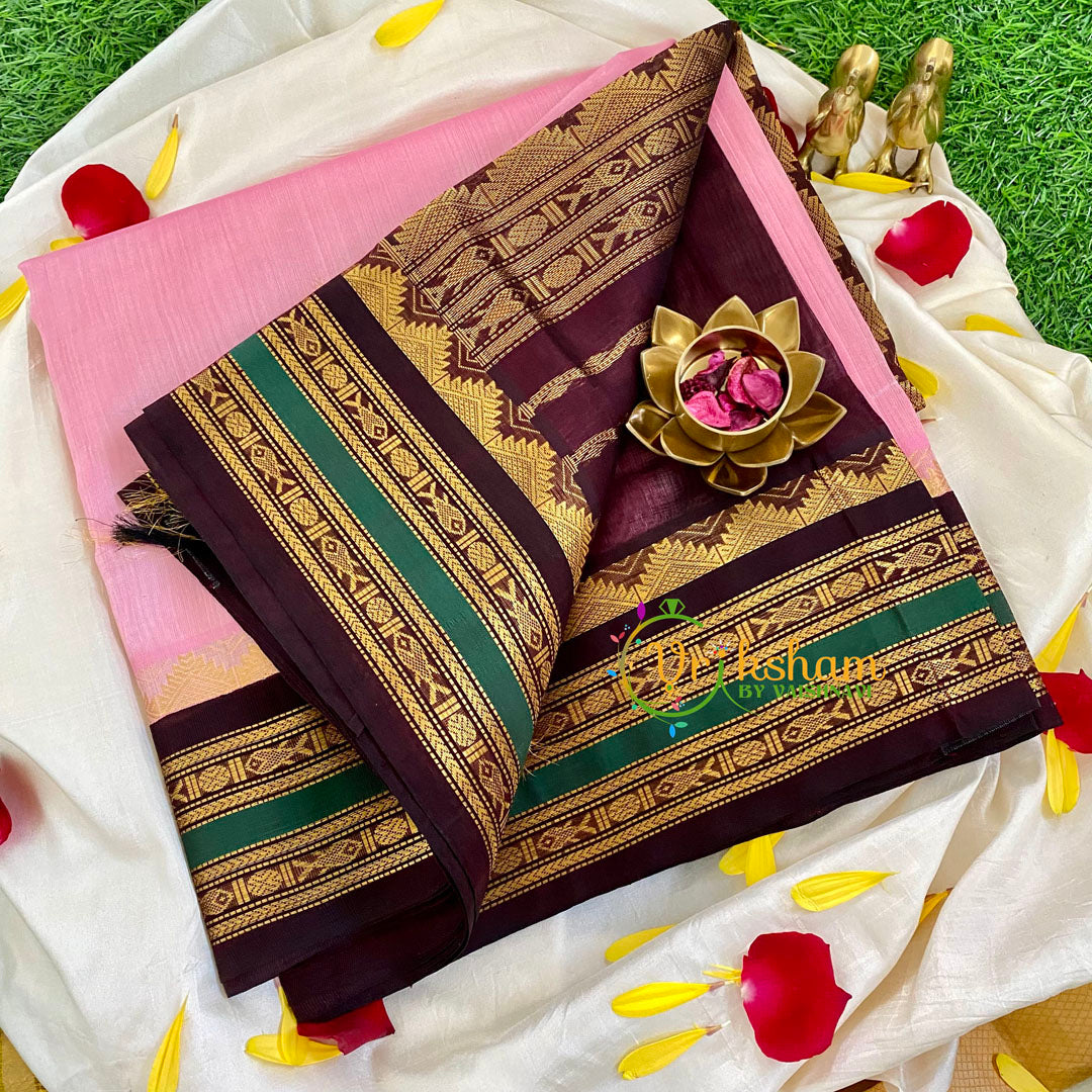 Rose Milk Pink Silk Cotton Saree-Handloom Korvai- Festive wear saree –Plain Pattern throughout the saree; comes with Blouse attached. Two side contrast border and pallu.