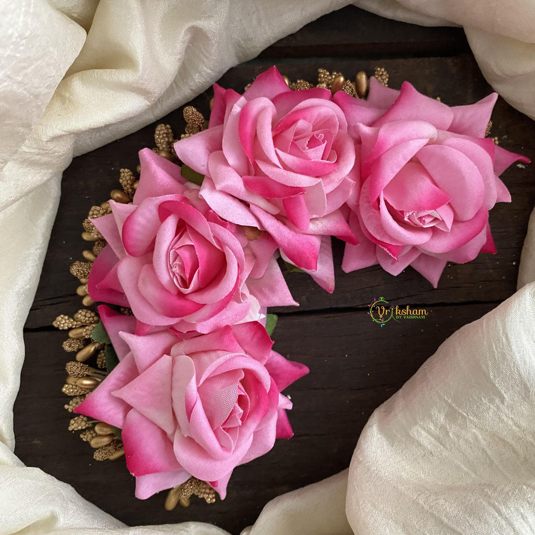 Rose Pink Veni with Gold Beads - Tear drop beads - Flower Accessory- veni– Tie around 'U' shaped type veni hair accessory.