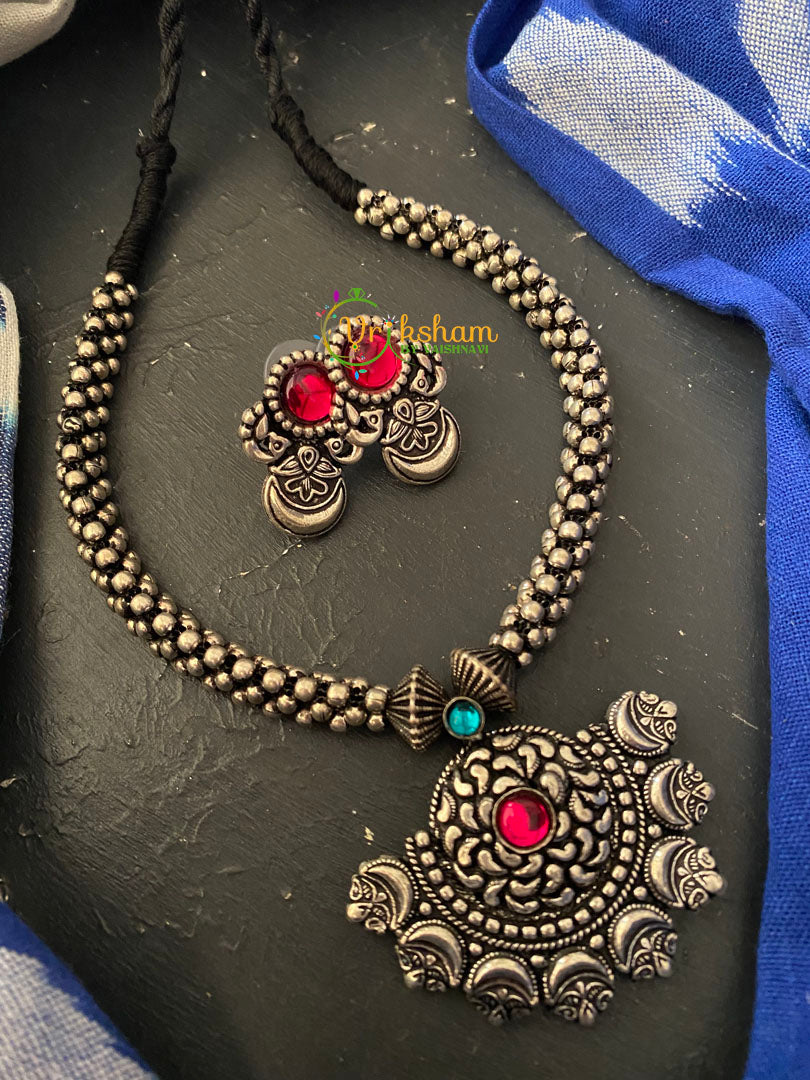 Round Pedant Kolhapuri Neckpiece -Red and Blue green– Silver look alike jewelry; one of a kind short neckpiece with adjustable black back rope/thread. Comes with earrings.