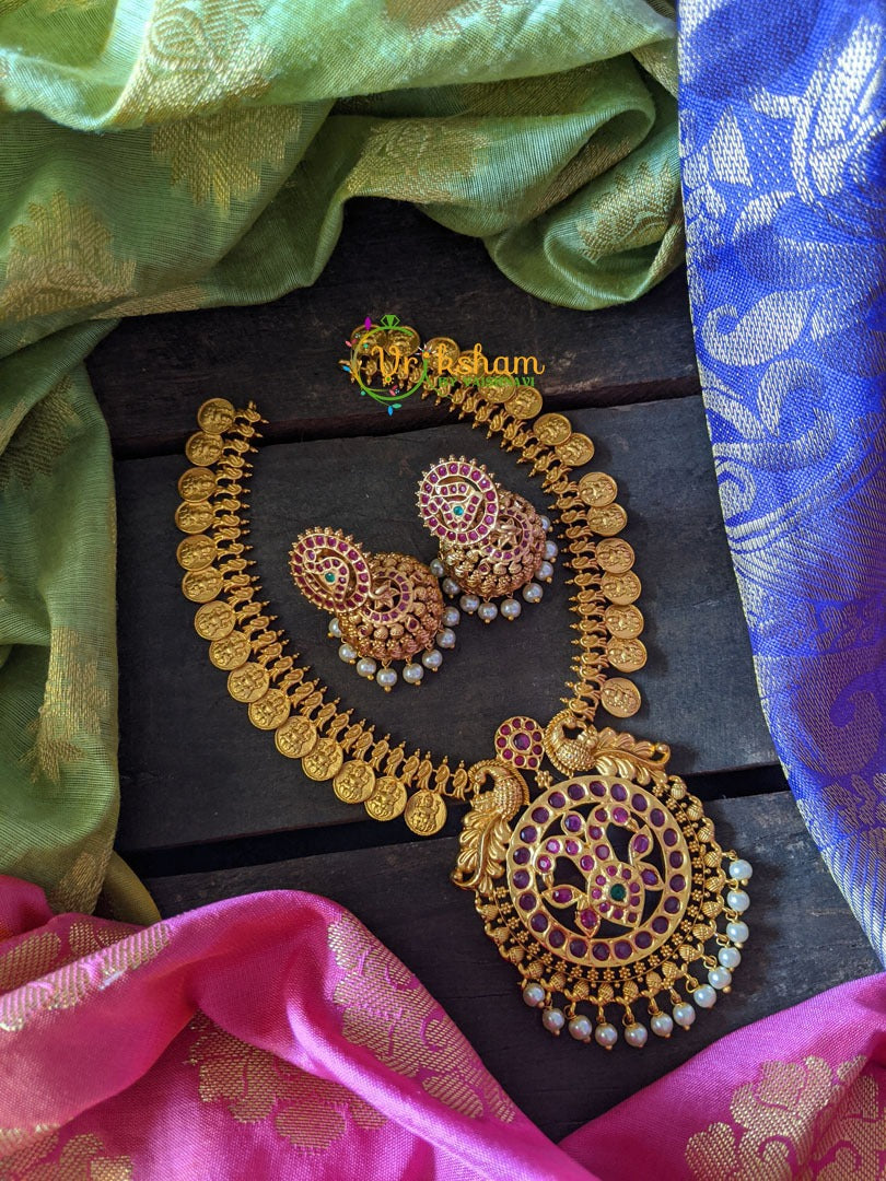 Round pendant Coin Neckpiece Jhumkas - This is a traditional round pendant neckpiece with dual peacock style and waxed stones in the pendant, this also has some pearl drops at the bottom