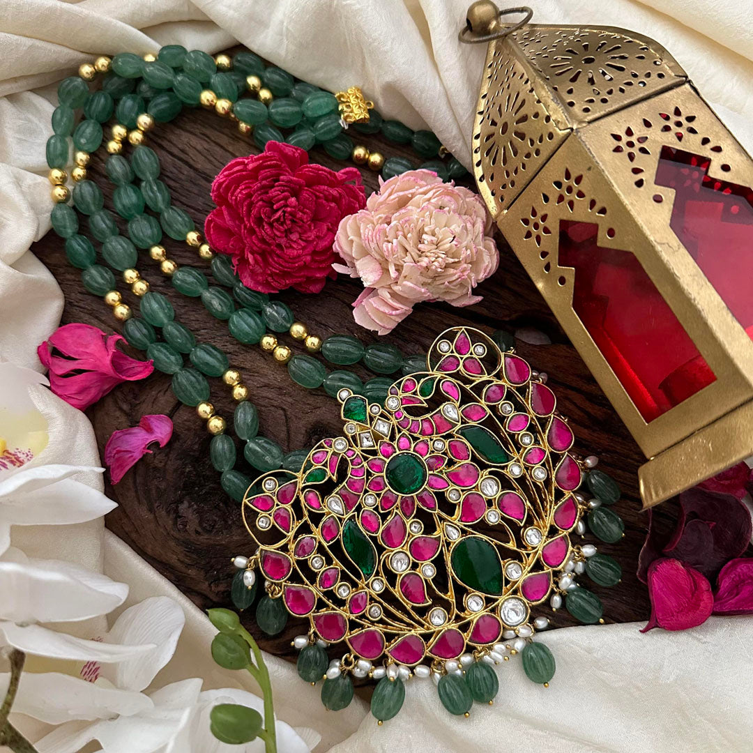 Indulge in luxury with our Royal 2 Layer Jadau Kundan Pendant Haram. Featuring exquisite Kundan craftsmanship, adorned with pearls and green beads, this necklace is the epitome of elegance. Elevate your style with this statement piece, fit for a queen.
