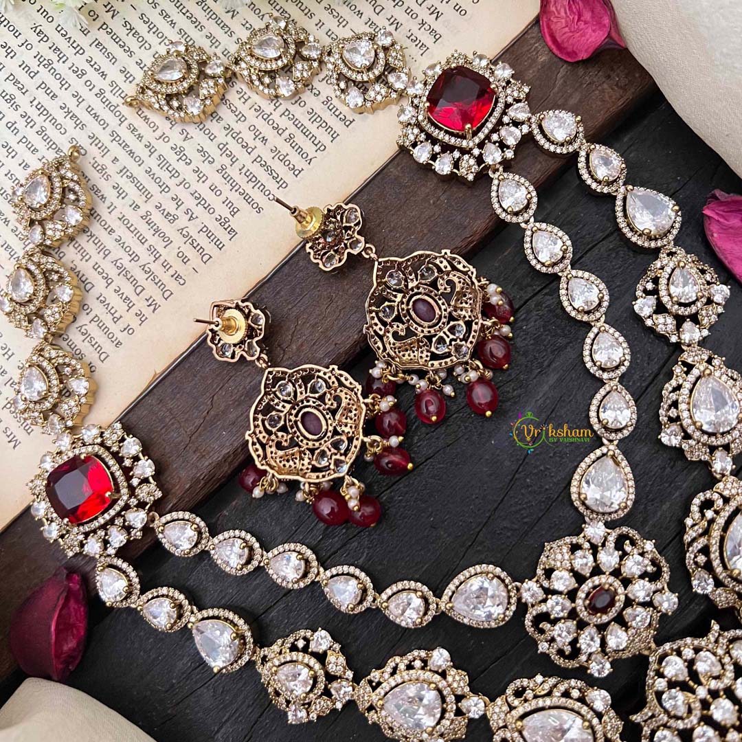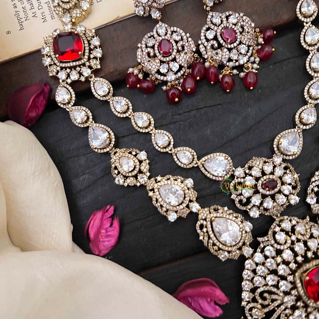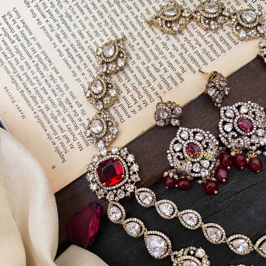 Exude elegance with our Royal 2 Layer Ruby Red Victorian Diamond Neckpiece. Featuring a stunning red bead, this neckpiece is fit for royalty. With its intricate design and luxurious materials, it will add a touch of sophistication to any outfit. Feel regal and confident with this exclusive piece.