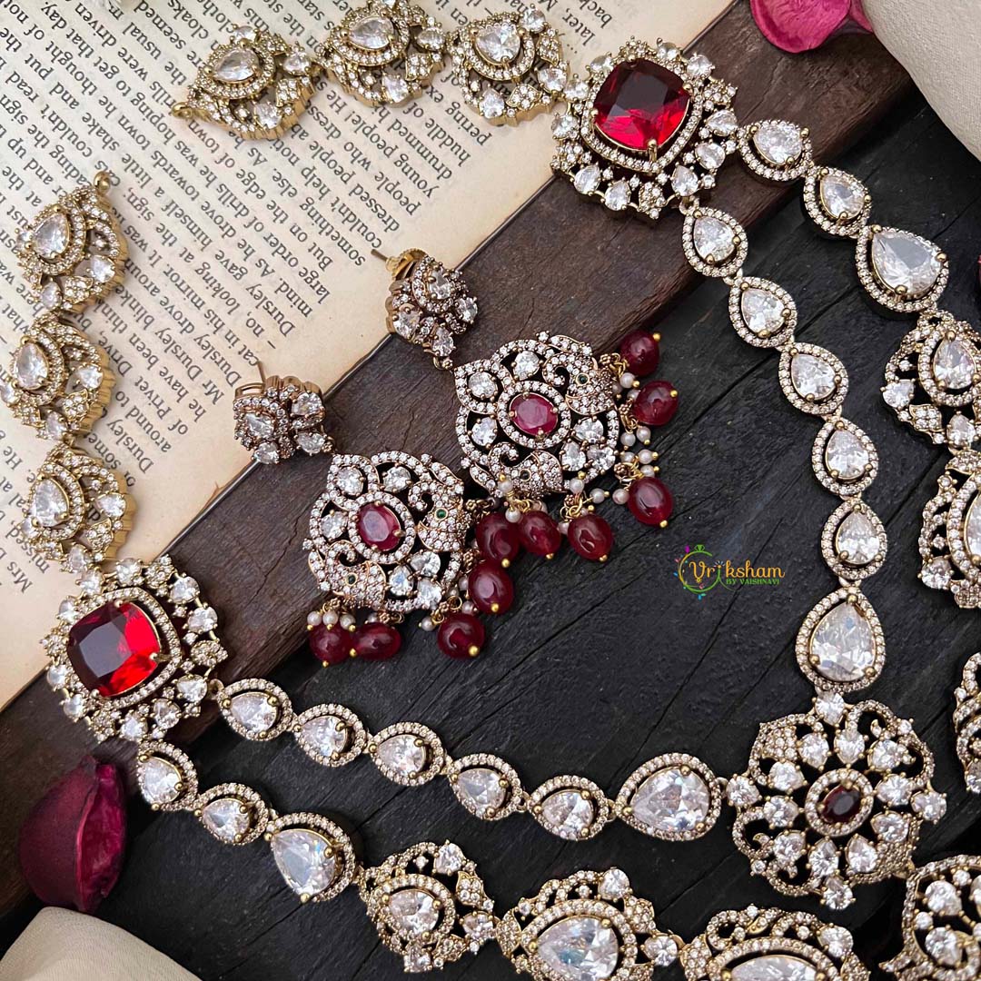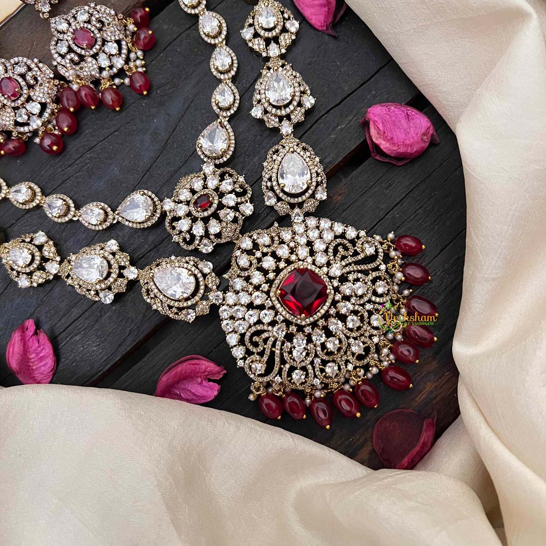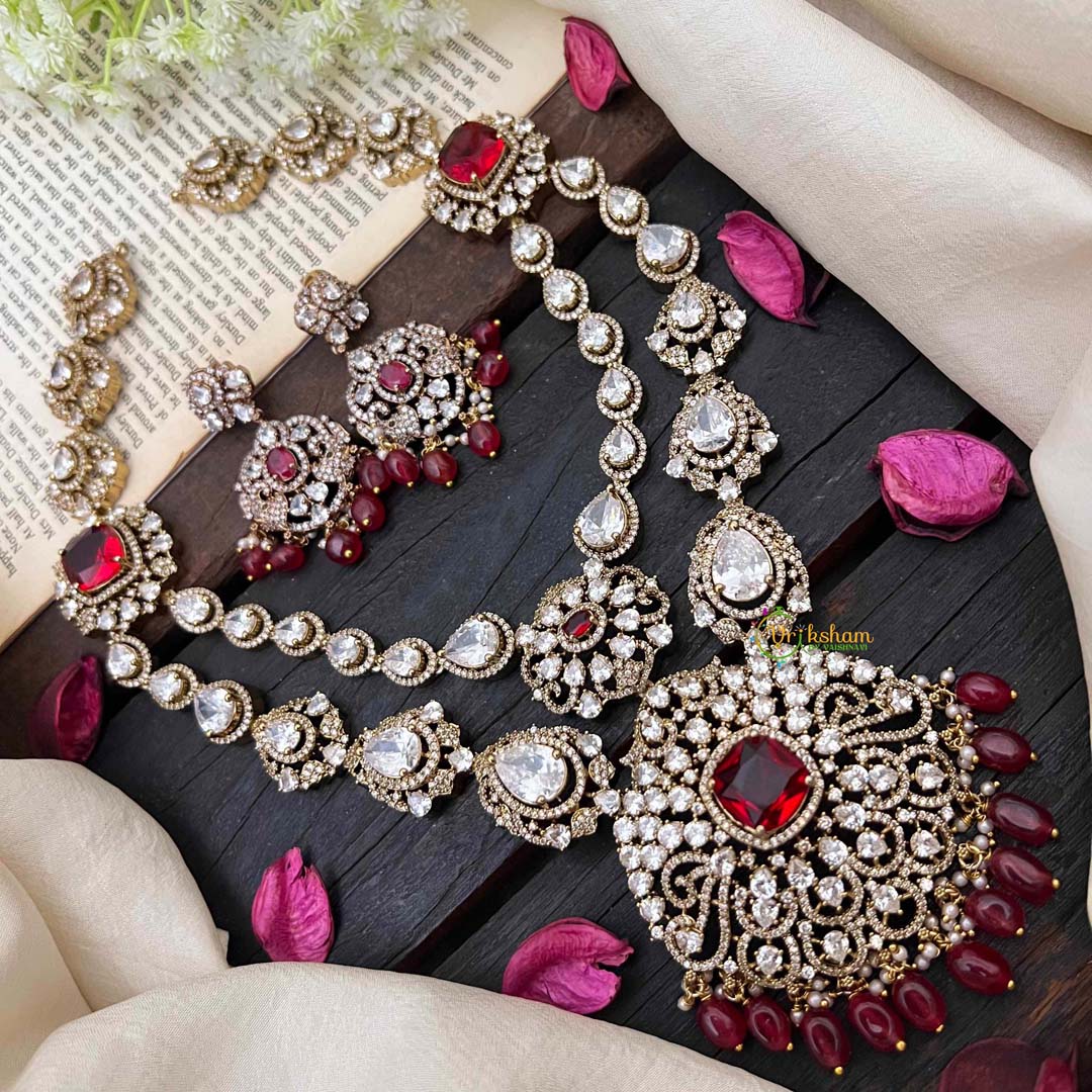 Exude elegance with our Royal 2 Layer Ruby Red Victorian Diamond Neckpiece. Featuring a stunning red bead, this neckpiece is fit for royalty. With its intricate design and luxurious materials, it will add a touch of sophistication to any outfit. Feel regal and confident with this exclusive piece.
