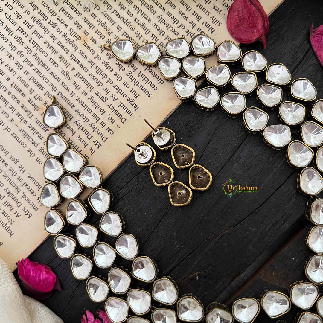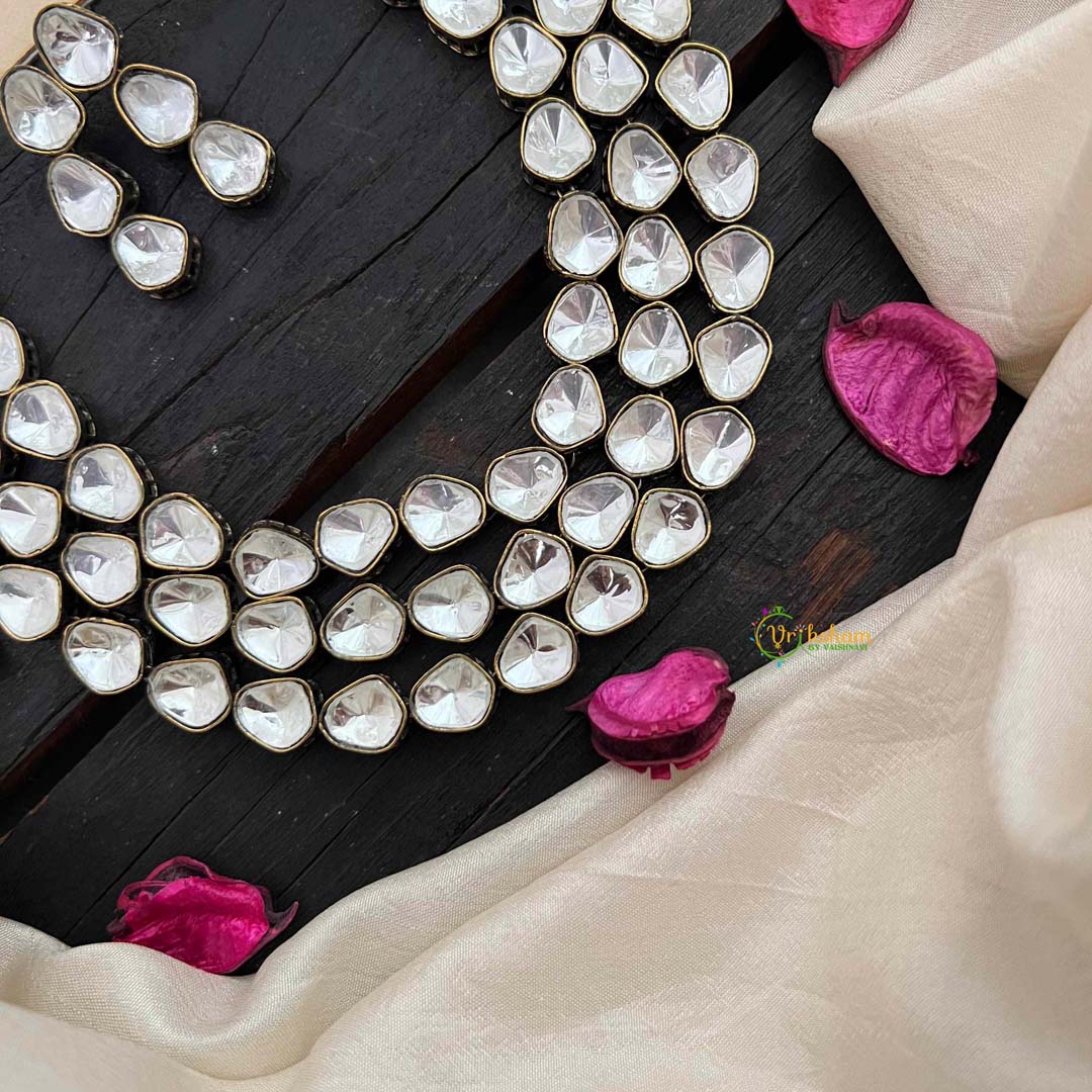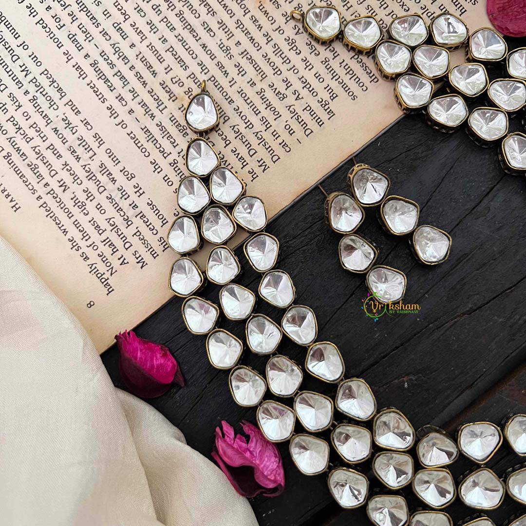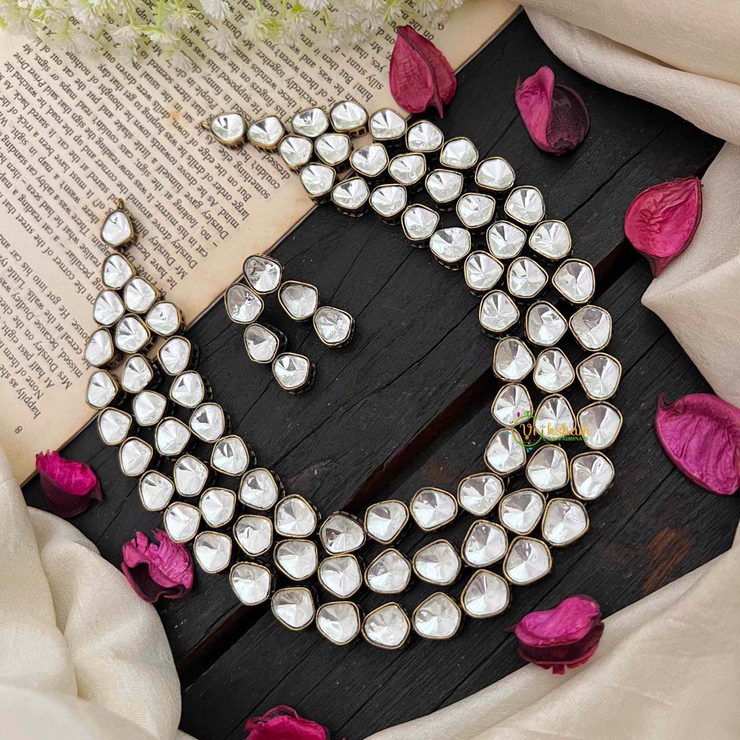 Add a touch of elegance to your outfit with our Royal 3 Layer White Victorian Diamond Short Necklace. The layered design and sparkling diamonds make this piece a must-have for any formal event or special occasion. Elevate your look and feel like royalty with this stunning necklace. Comes with matching earrings.