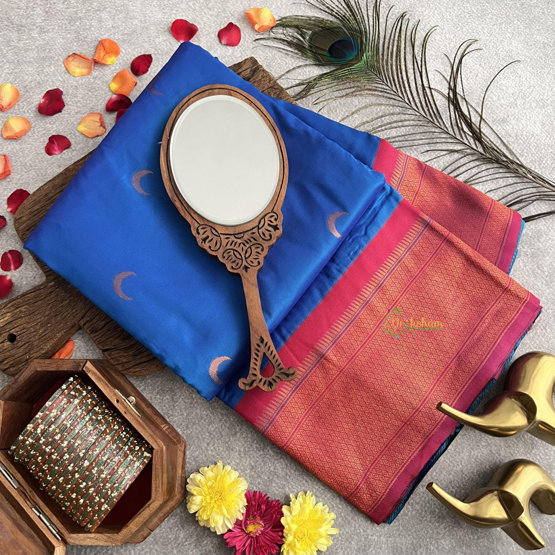 Elevate your elegance with our Royal Blue Chandrakor Tana Katan Silk Paithani Saree. Made with luxurious silk, this saree features a unique nath pallu, adding a touch of sophistication to your style. Wrap yourself in comfort and grace with this exclusive piece.