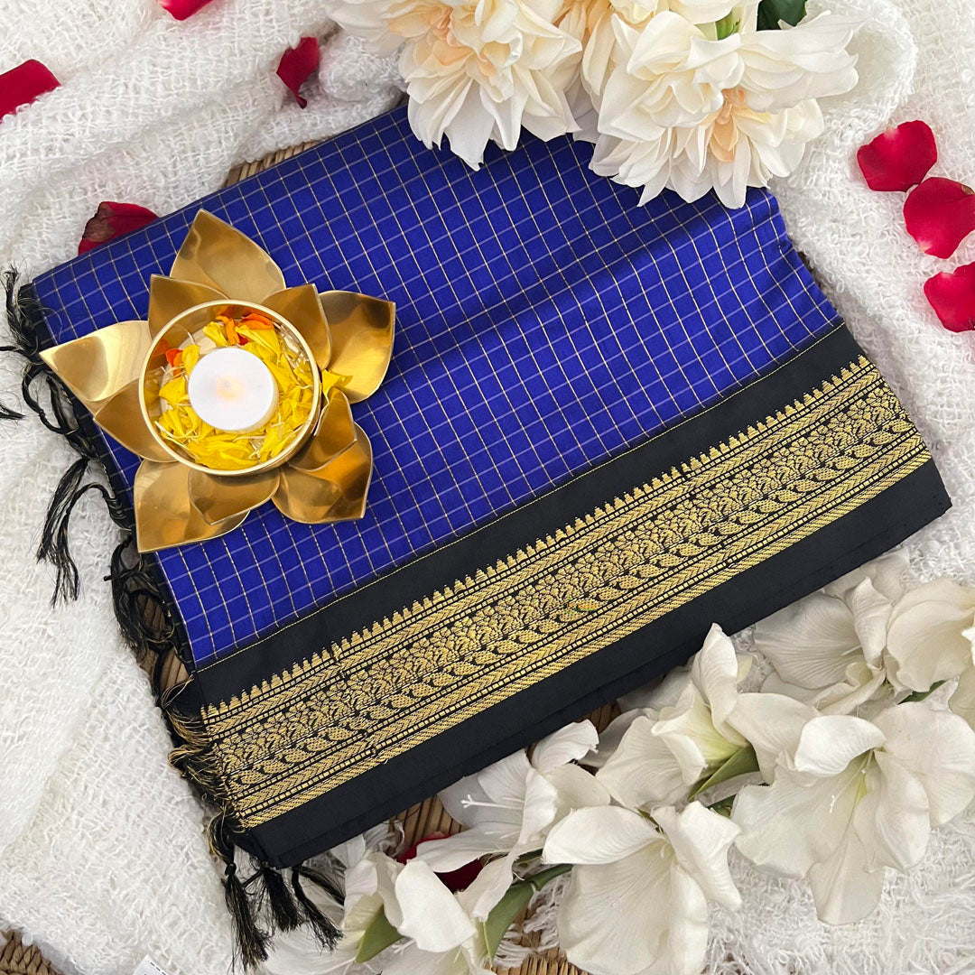 Elevate your traditional wardrobe with our stunning Royal Blue With Black Border-Vairaoosi Podi Kattam Kalyani Cotton Saree. Made from high-quality Kalyani cotton, this saree features a contrast border and intricate zari work, adding elegance to your look. The Vairaoosi Podi Kattam means small checks, add a unique touch to this saree, making it a must-have for any occasion!