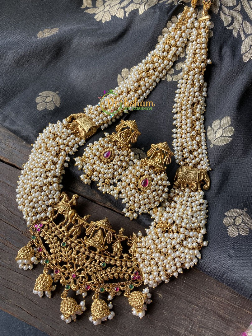 Royal Bridal Procession -Pearl Haram - Full length layer of cluster pearls with elephant mugappu and broad bridal procession pendant giving a unique royal look. Comes with bride ear hangings.