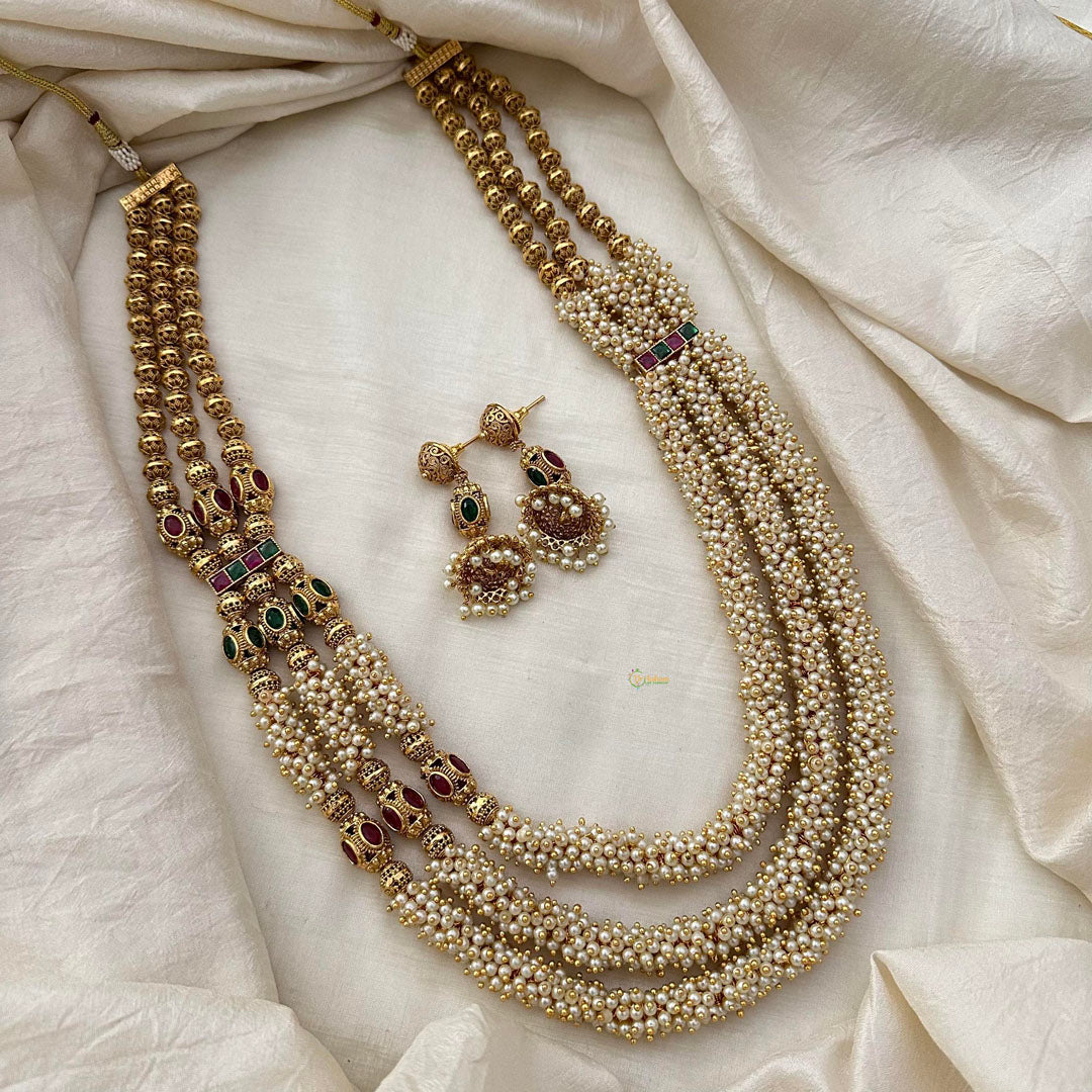 Royal Cluster Pearl 3 Layer Malai with Golden Bead-Red Green-G13378