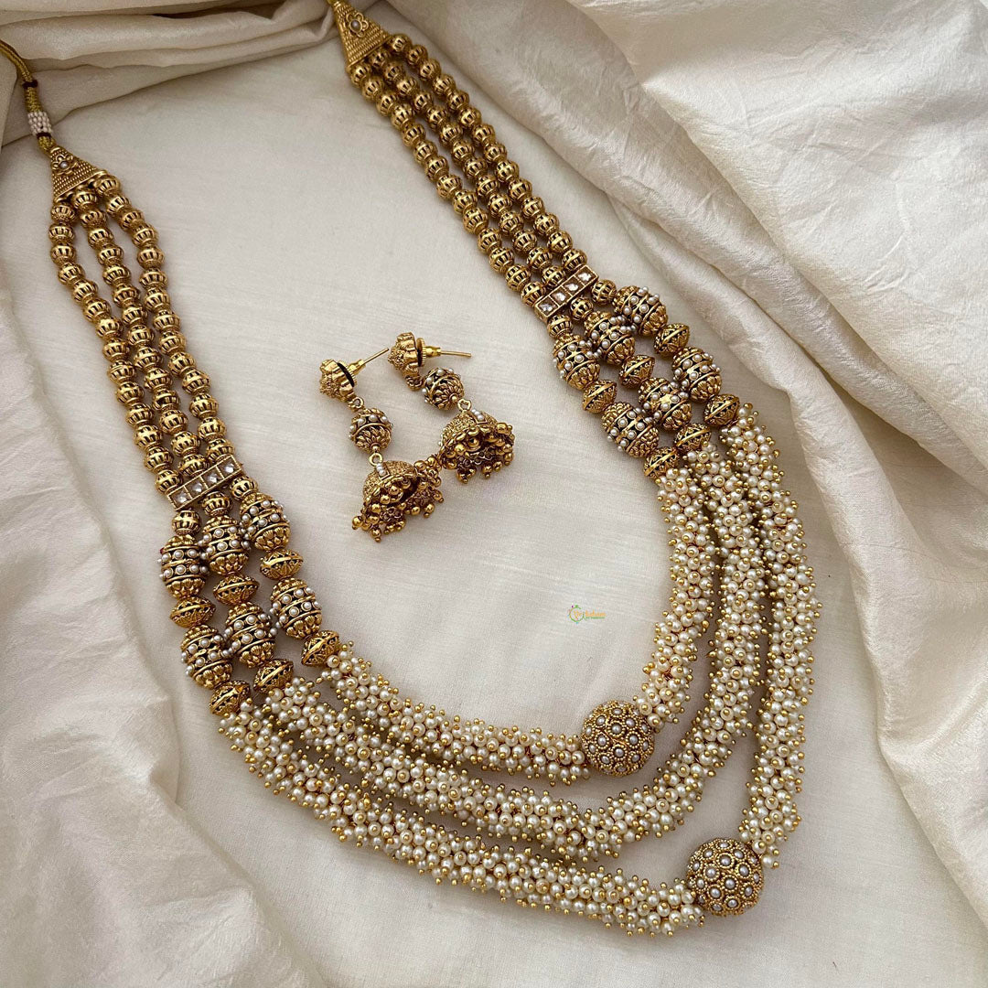 Enhance your regal look with the Royal Cluster Pearl 3 Layer Malai. The stunning layers of pearls, accentuated by golden beads, add an air of luxury and sophistication. Complete your ensemble with the matching jhumkas for a truly exclusive and elegant presence.