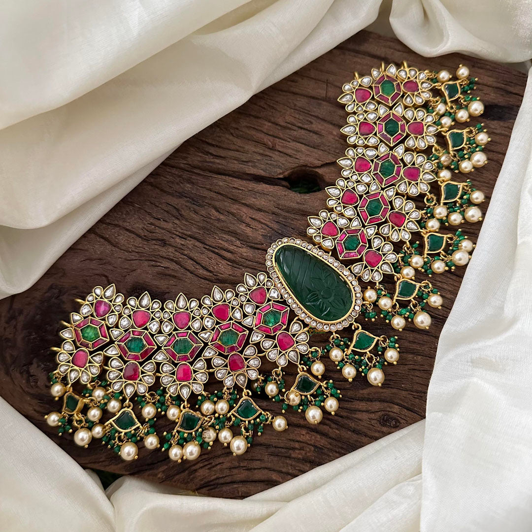 Make material :Royal Kundan Jadau Choker Neckpiece -Emerald Green- is made of Kundan Precious stones, temple make, artificial pearls, Copper and brass alloy.