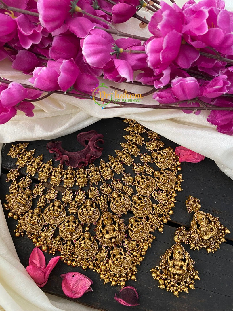 Exquisite Layered Royal Lakshmi High Neck Choker -a complete multiple Lakshmi neckpice arranged in linear and layer fashion intricate one of a kind unique temple choker. Comes with matching danglers;