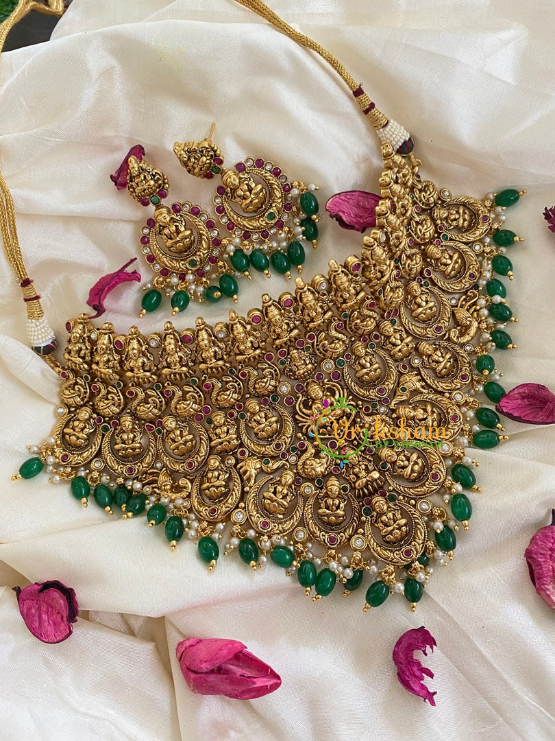Exquisite Layered Royal Lakshmi High Neck Choker -a complete multiple Lakshmi neckpice -green bead finish arranged in linear and layer fashion intricate one of a kind unique temple choker. Comes with matching danglers;