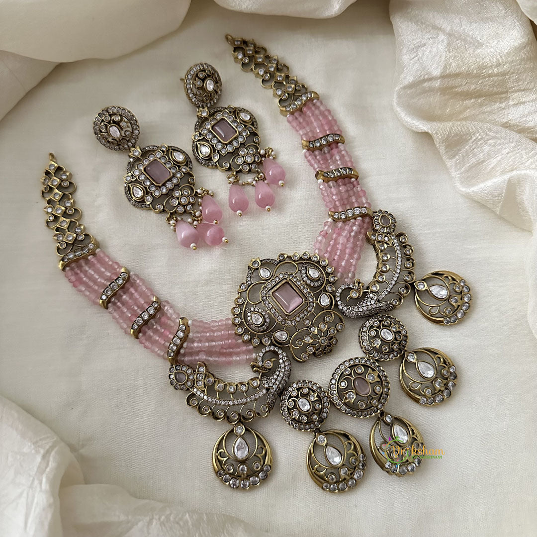 Discover the graceful elegance of our Royal Multilayer Victorian Diamond Pendant Choker. This designer piece features a stunning white Victorian diamond dual peacock design, adorned with pastel pink beads and two pastel pink stones. With a multi-layered choker design, it exudes luxury and sophistication, making it the perfect statement piece for any formal occasion. Comes with matching earrings.