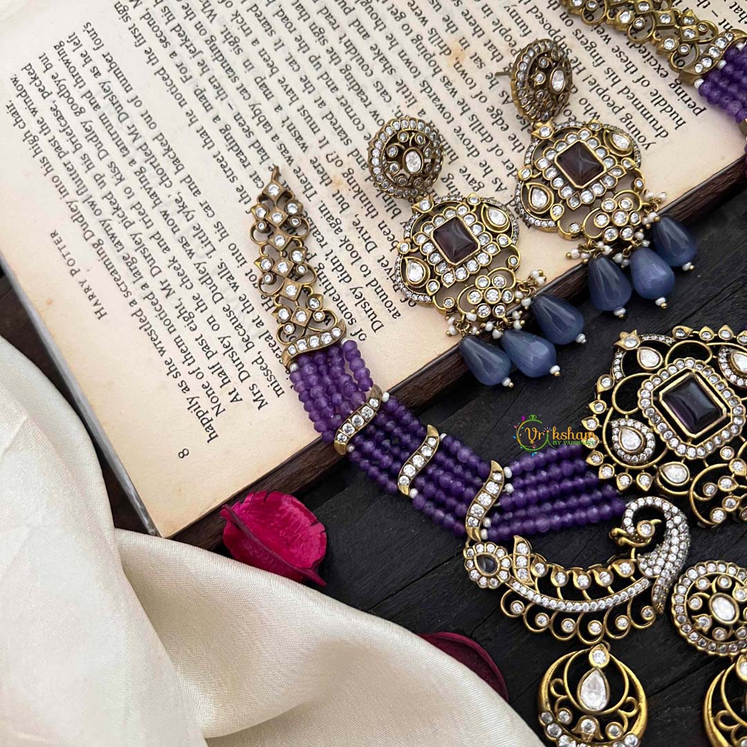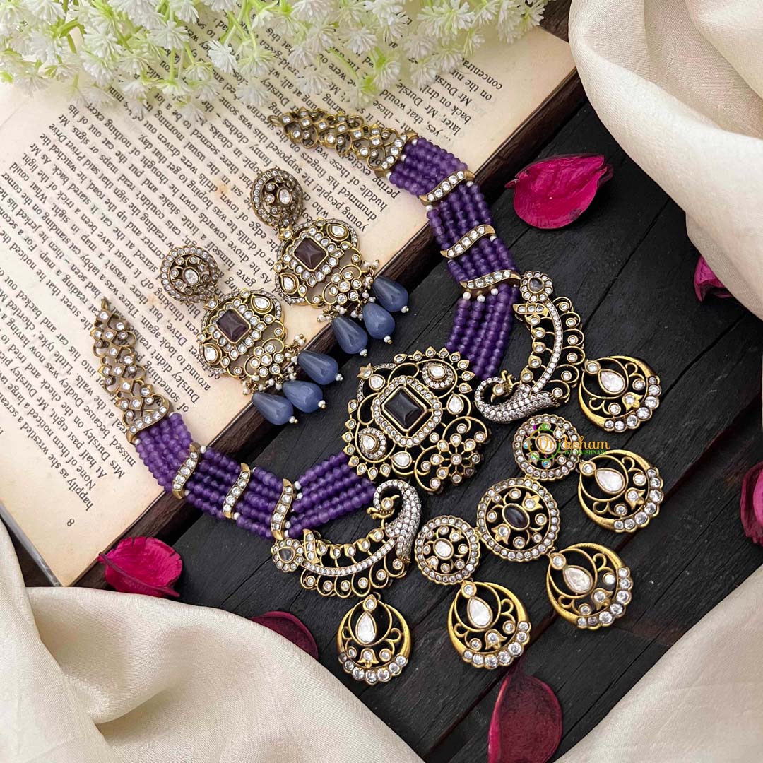 Discover the graceful elegance of our Royal Multilayer Victorian Diamond Pendant Choker. This designer piece features a stunning white Victorian diamond dual peacock design, adorned with purple beads and two purple stones. With a multi-layered choker design, it exudes luxury and sophistication, making it the perfect statement piece for any formal occasion. Comes with matching earrings.