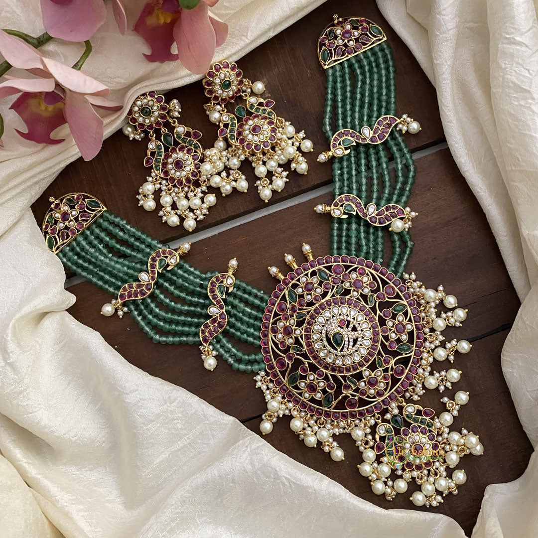 Indulge in pure luxury with our Royal Multilayered Short Pendant Neckpiece. Pastel green beads and pearls are intricately layered, adorned with a touch of precious kemp stone in red, green, and white. A unique blend of elegance and opulence, this necklace is the epitome of high-end fashion. Comes with matching earrings.