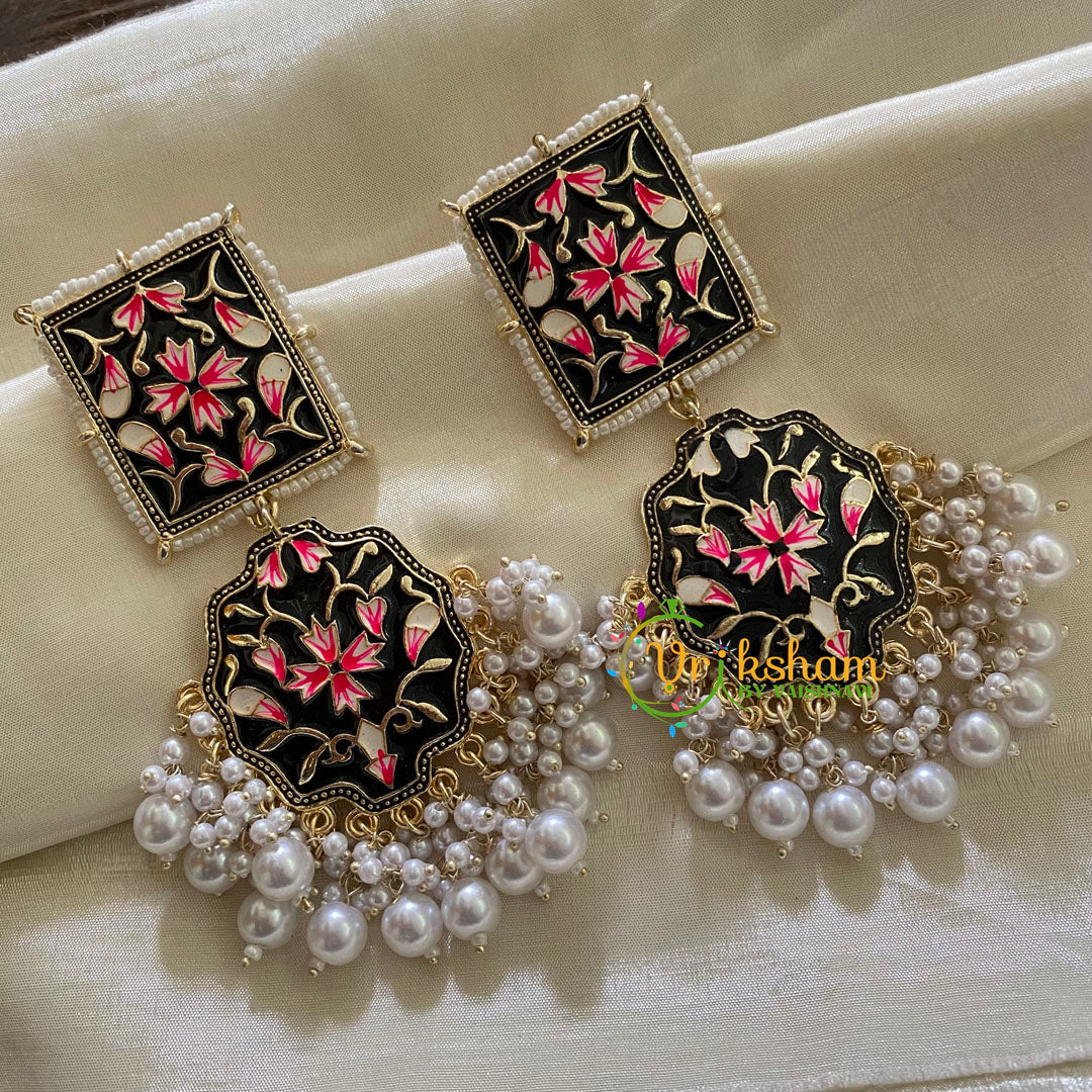 Royal Princess Meenkari Danglers-Black enamel painted with floral and bird patterns; Pearl arranged on borders and cluster pearl finish.
