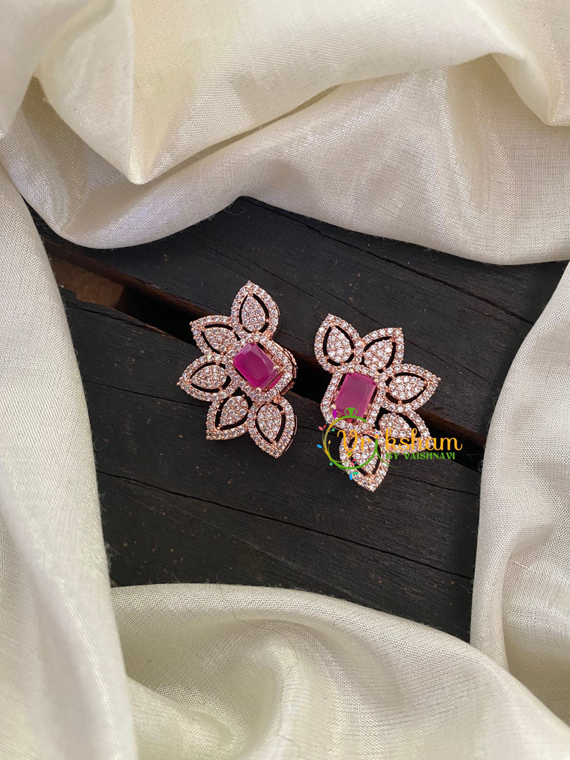 Rose Gold Ruby American Diamond Stud -Designer wear ad earrings; comes as a pair.