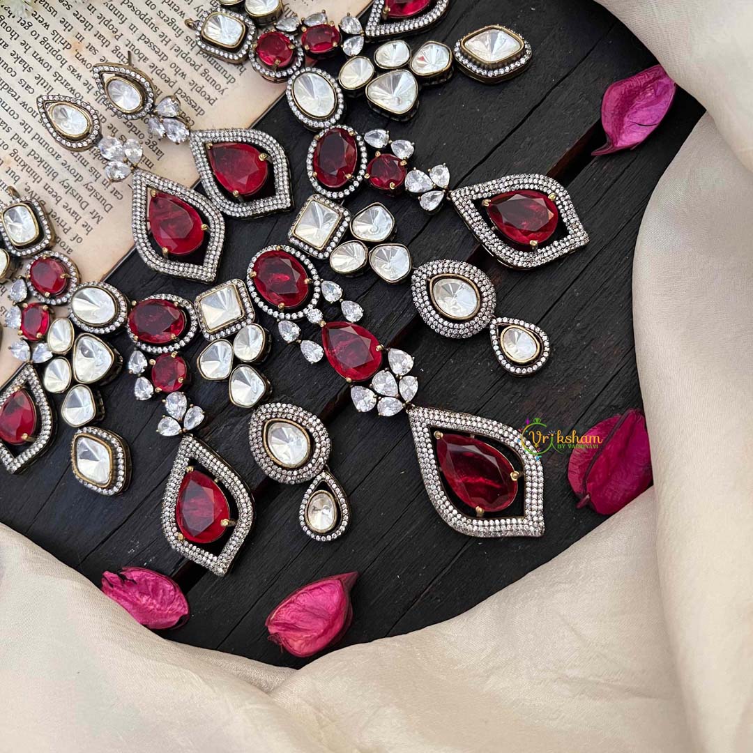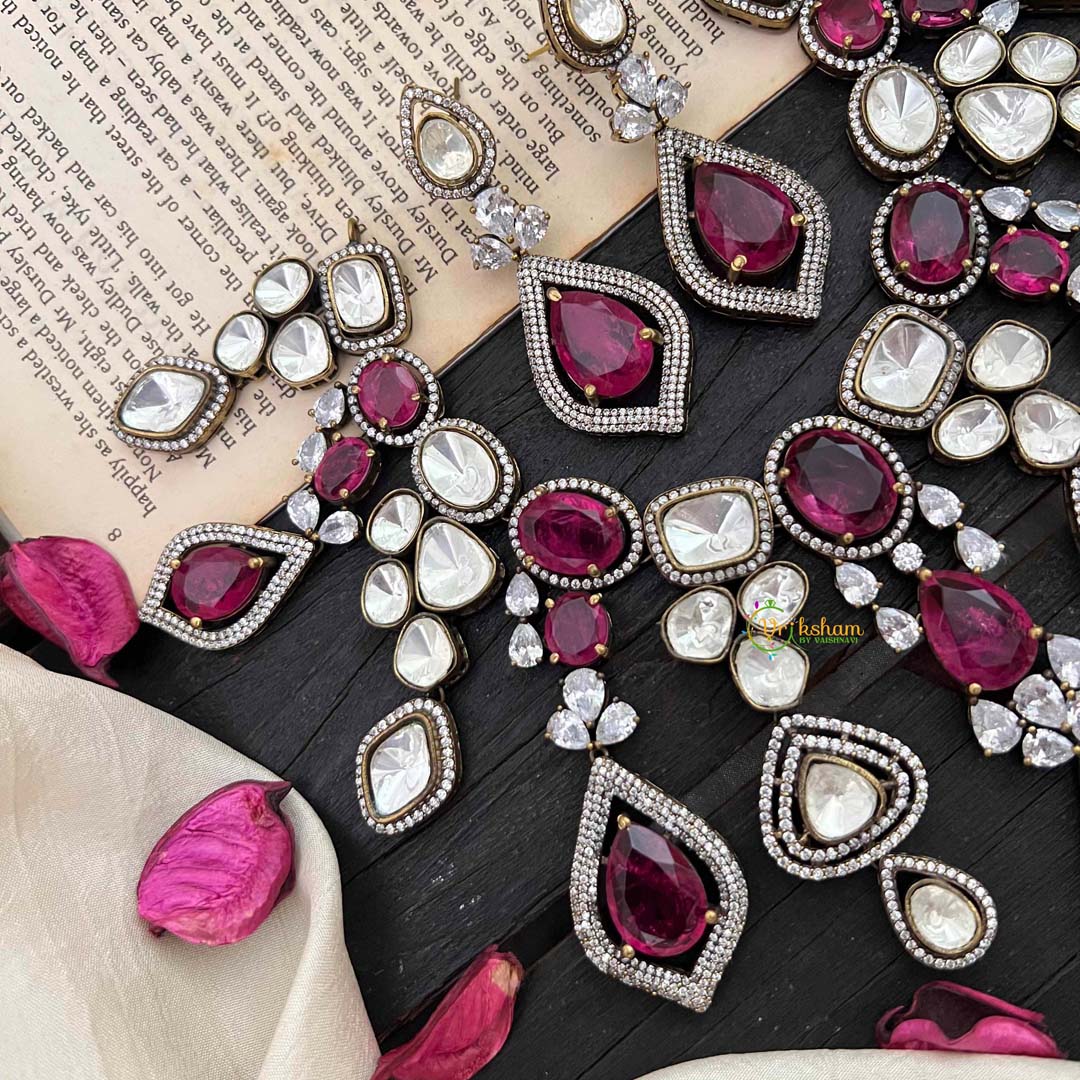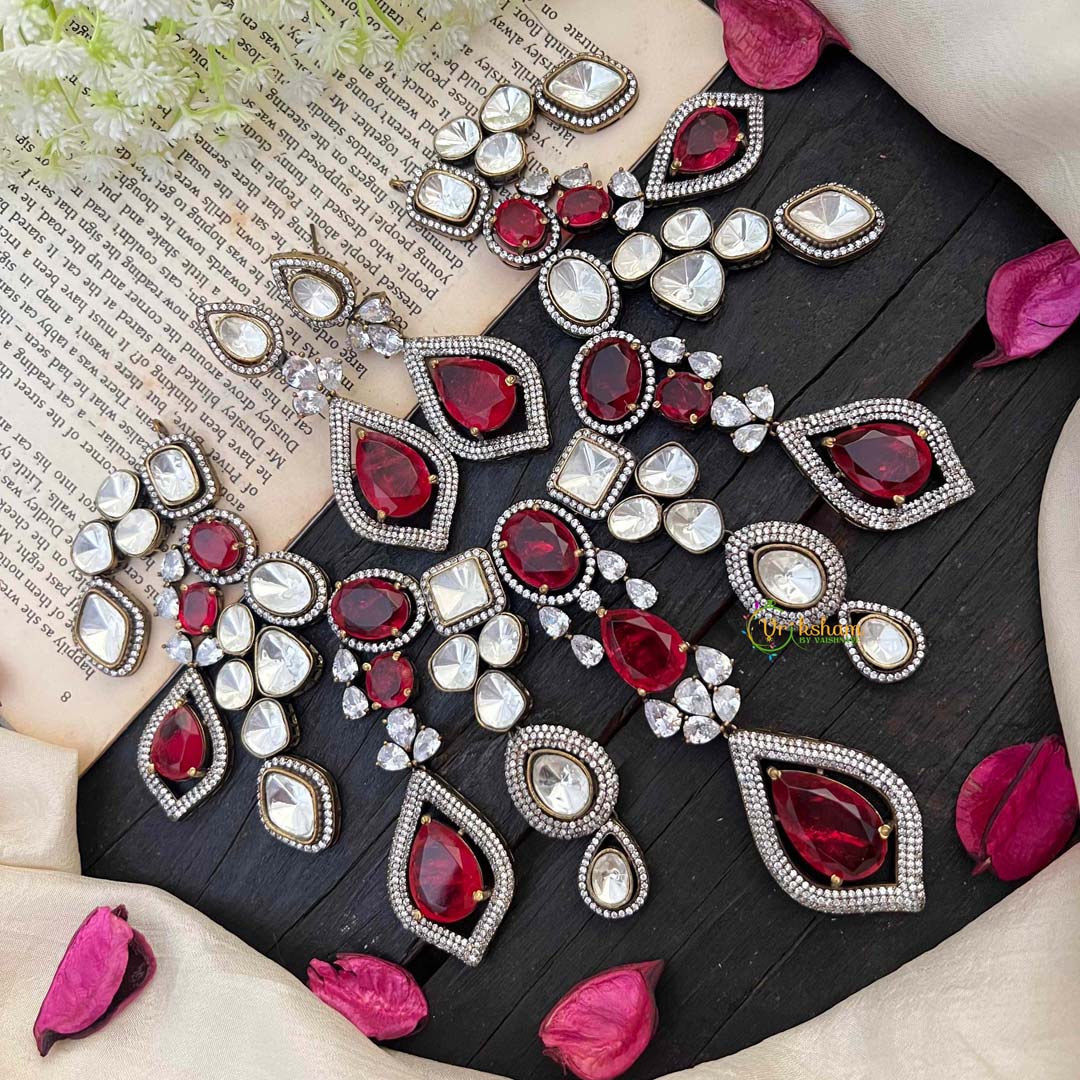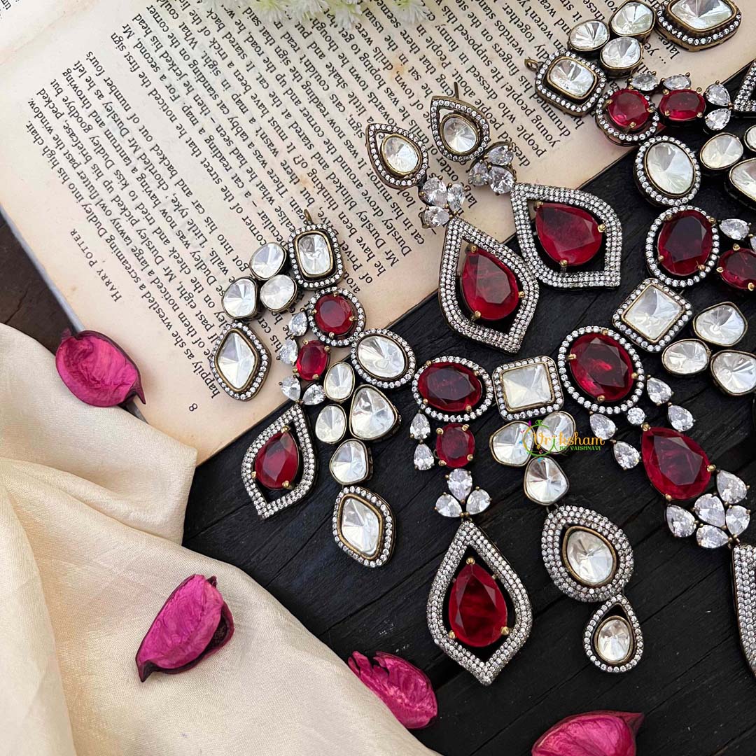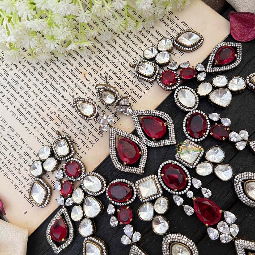 Premium Victorian Diamond Choker Short Neckpiece - white and red color semi precious stone studded ; royal statement jewelry; comes with matching earrings.