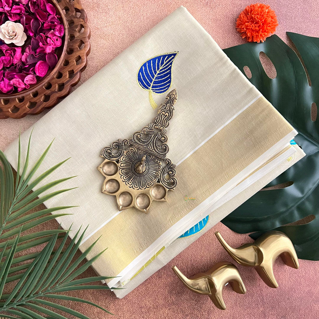 Elevate your wardrobe with our Sandal Color Kasavu Tissue Cotton Saree, featuring intricate hand embroidery of delicate leaves in two contrasting tones. Made from premium tissue cotton, this saree exudes sophistication and elegance, making it a perfect addition to any occasion. Upgrade your style with this exclusive piece.