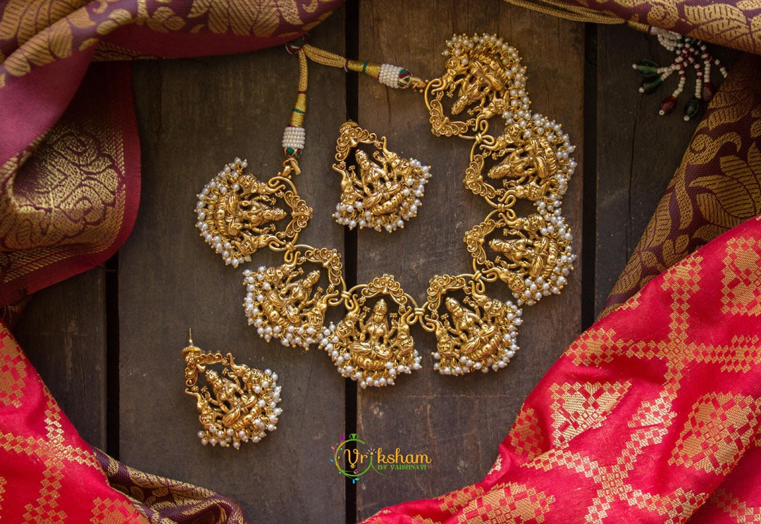MAKE MATERIAL – This beautiful Saptha Lakshmi Neckpiece - Pearl with earrings is made of gold look alike finish with no stone look.