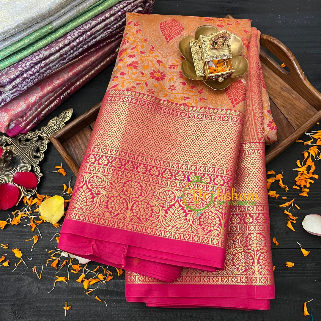 Pastel Silk with Pink Border Saree-Kanchi Silk Saree - Festive wear saree – Fern and motive Pattern throughout the saree; comes with Blouse attached. One side Big Border and other side lean border. Power loomed saree.