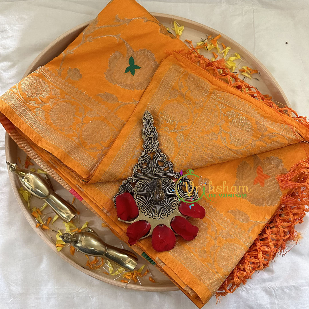Yellow Semi Benarasi Saree – Festive wear saree –Embroidery work throughout the saree; comes with Blouse attached. Two side traditional border.