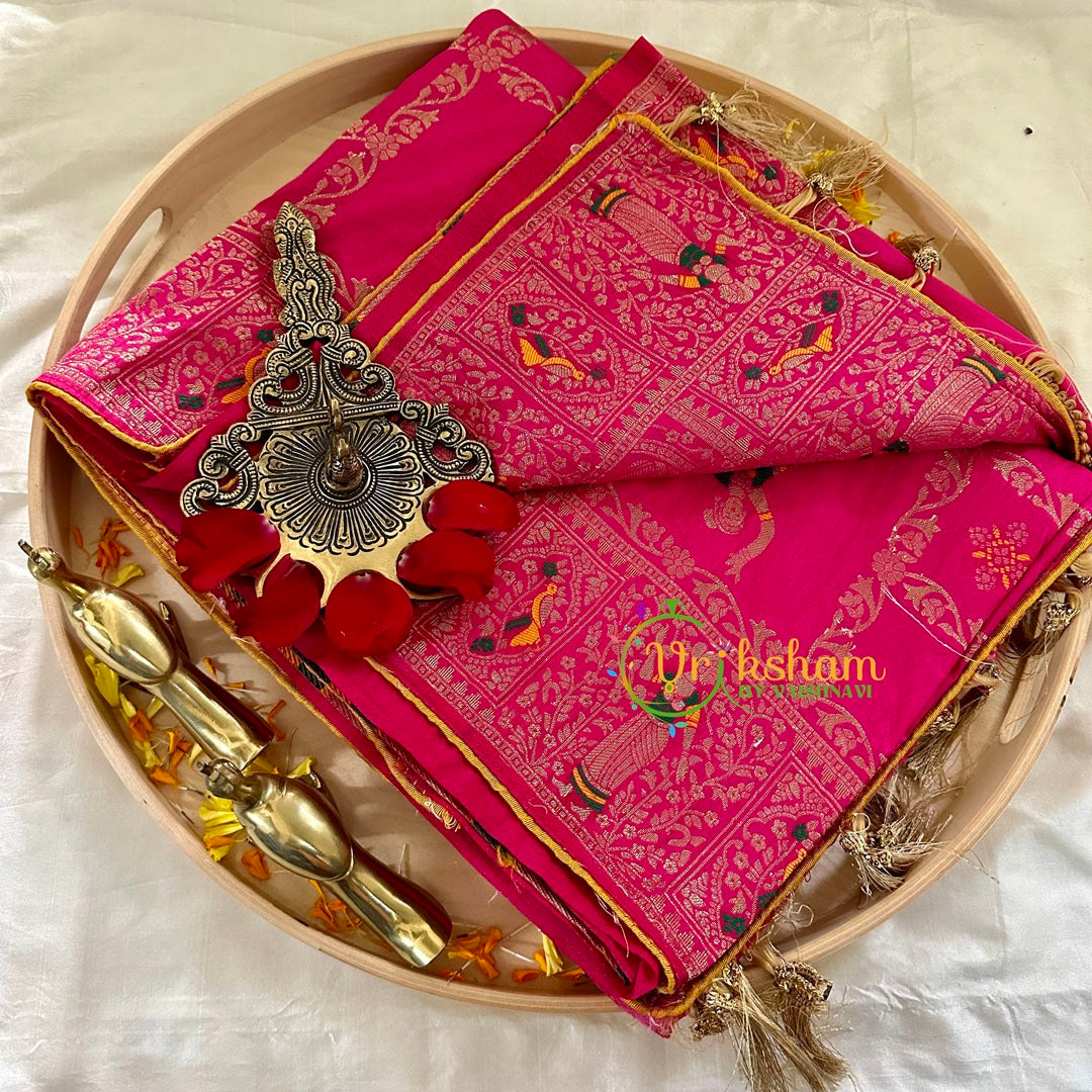 Rani Pink Semi Benarasi Saree – Festive wear saree –Embroidery work throughout the saree; comes with Blouse attached. Two side traditional border.